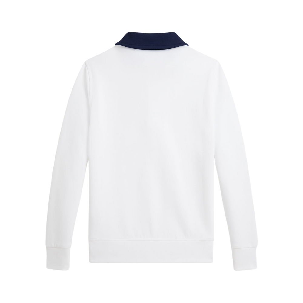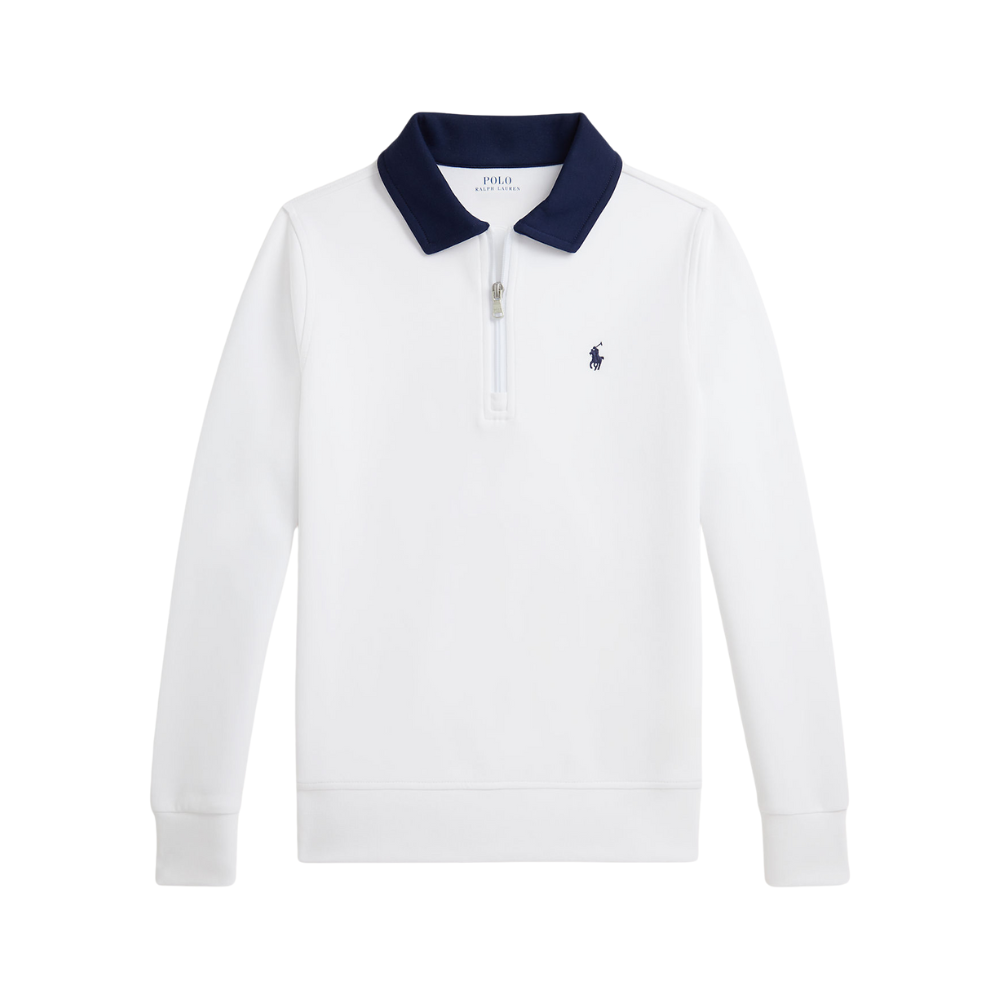 Hvít, hálf rennd peysa með dökk bláum kraga frá Polo Ralph Lauren. 75% bómull og 25% polyester.