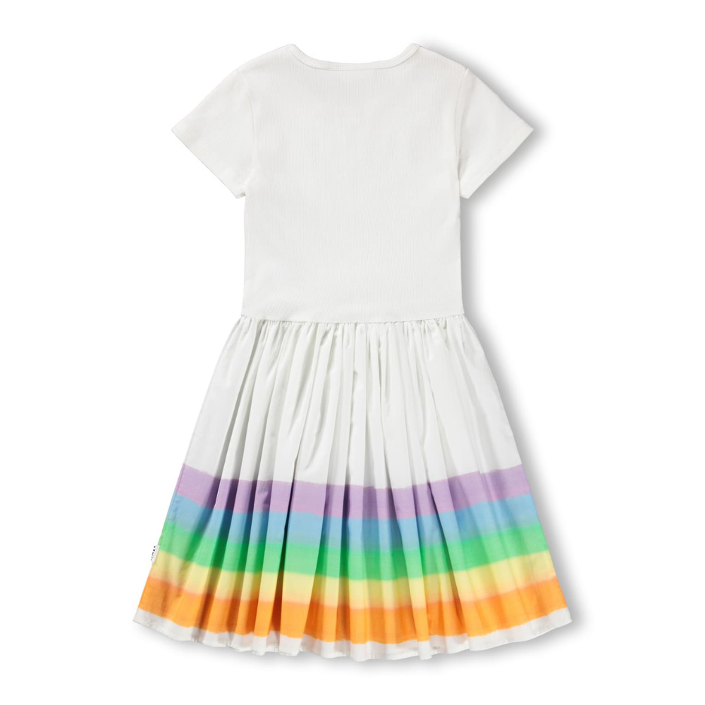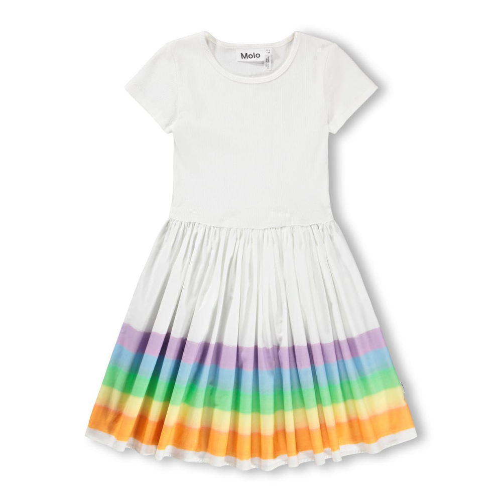 Hvítur Molo kjóll með stuttum ermum, einlitum efri part og mynstruðu pilsi. 100% bómull.