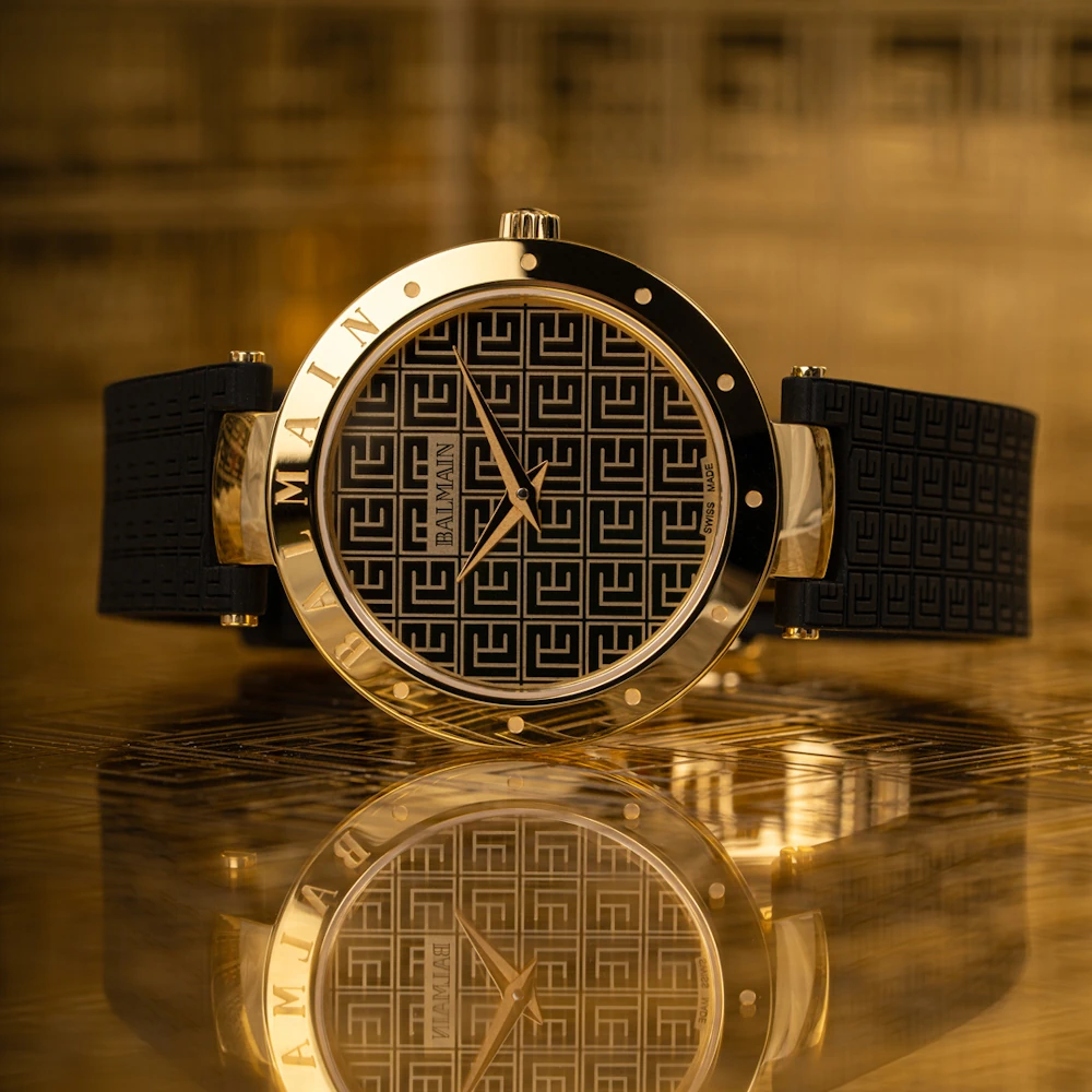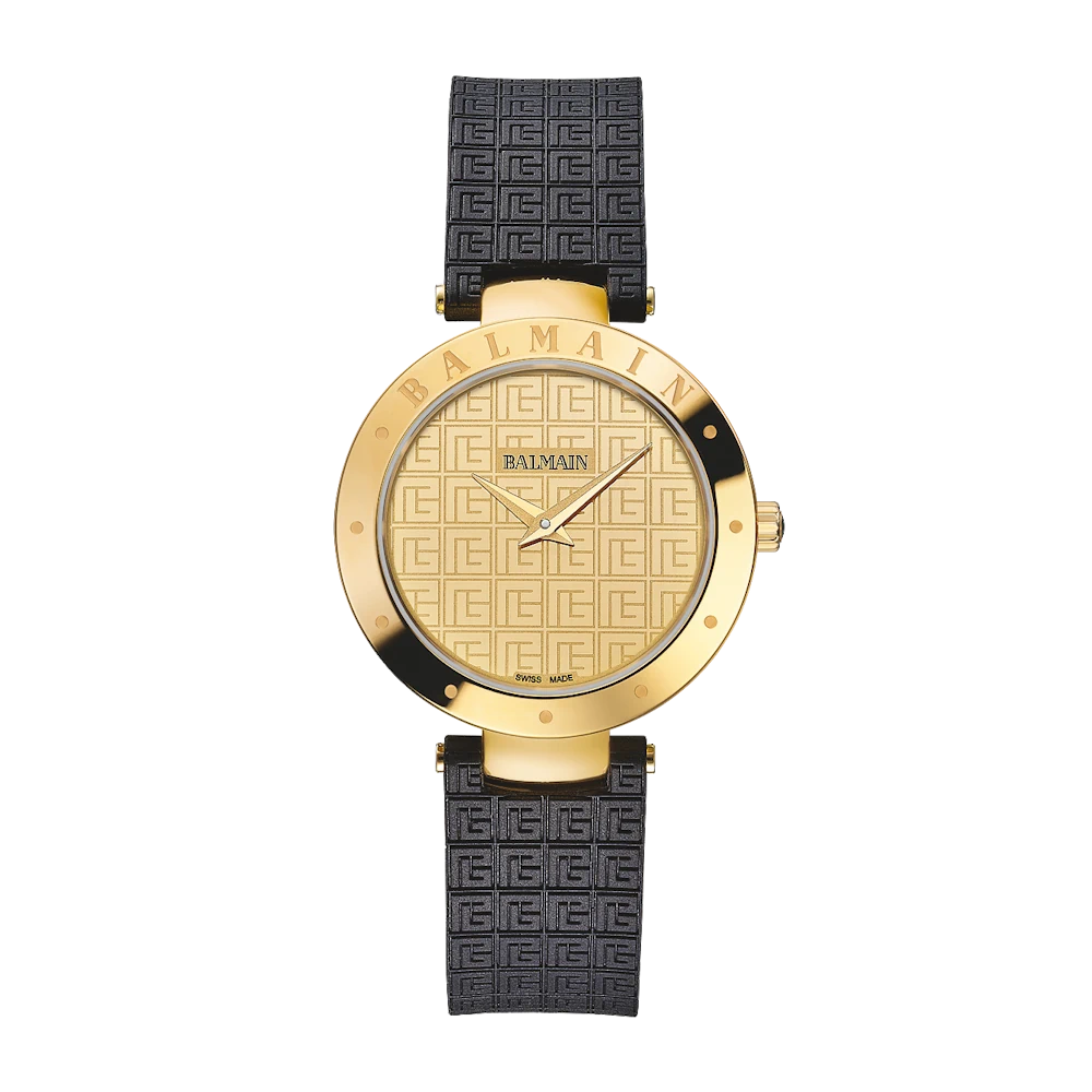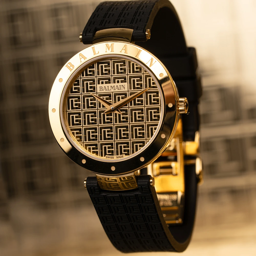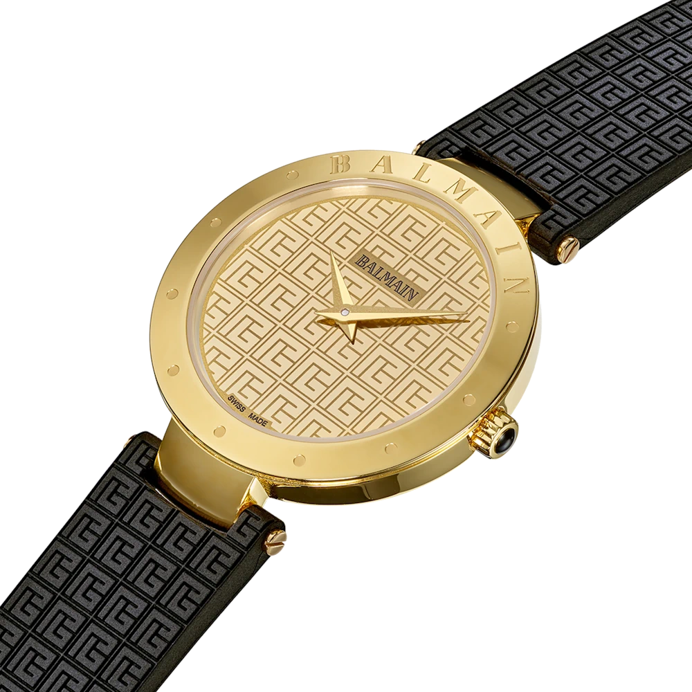 Úrkassi: 33mm – gyllt stál Úrverk: Rafhlaða – svissneskt Vatnsvörn: 30M Skífa: Gyllt með PB Balmain monogram – vísar Gler: Safírgler – speglunarvörn Ól: Gúmmí Ábyrgð: Tveggja ára