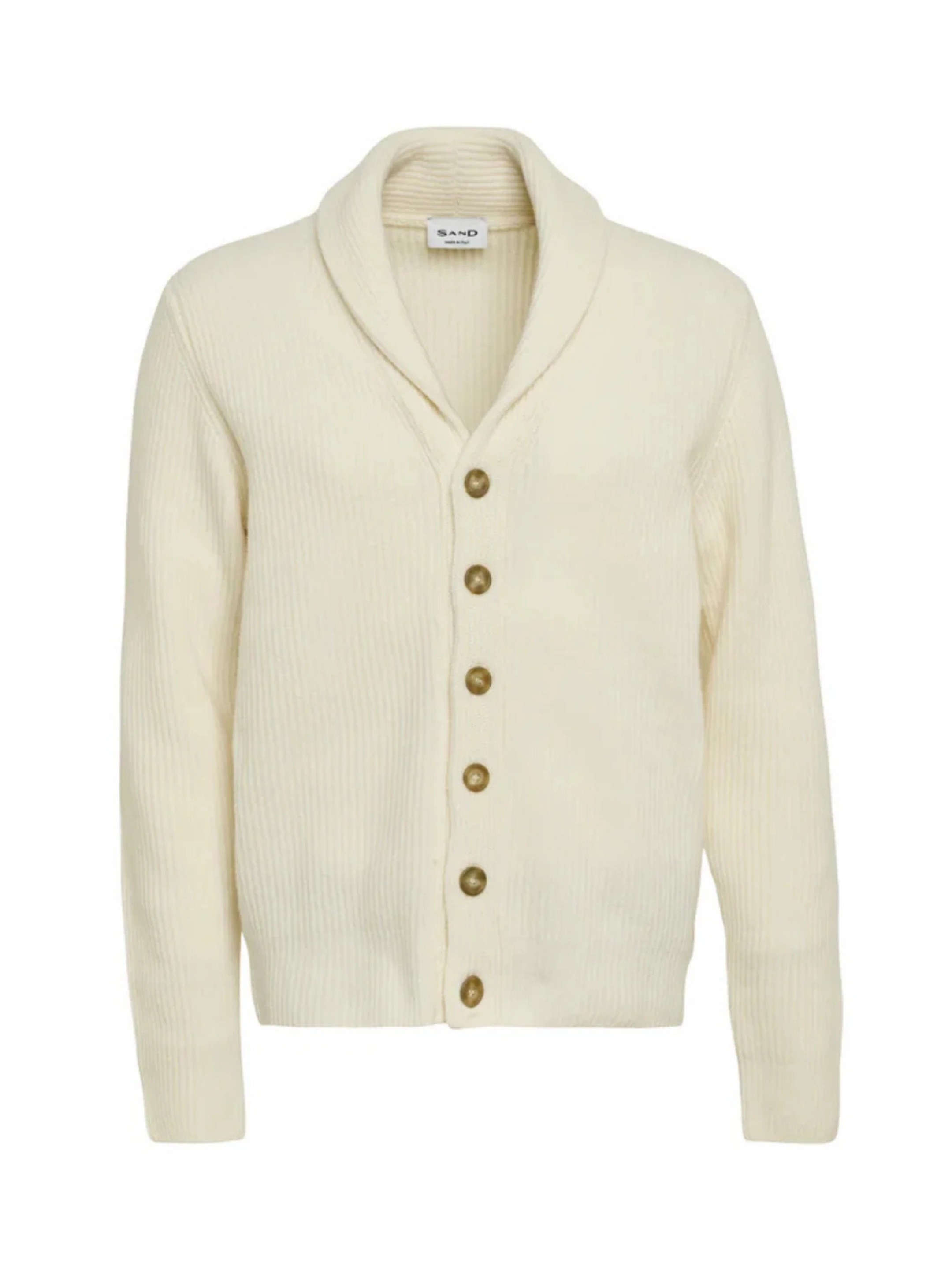 Shawl collar Front buttons closure Patched chest pocket Modern fit Lanerossi 7 Gauge Made in Italy