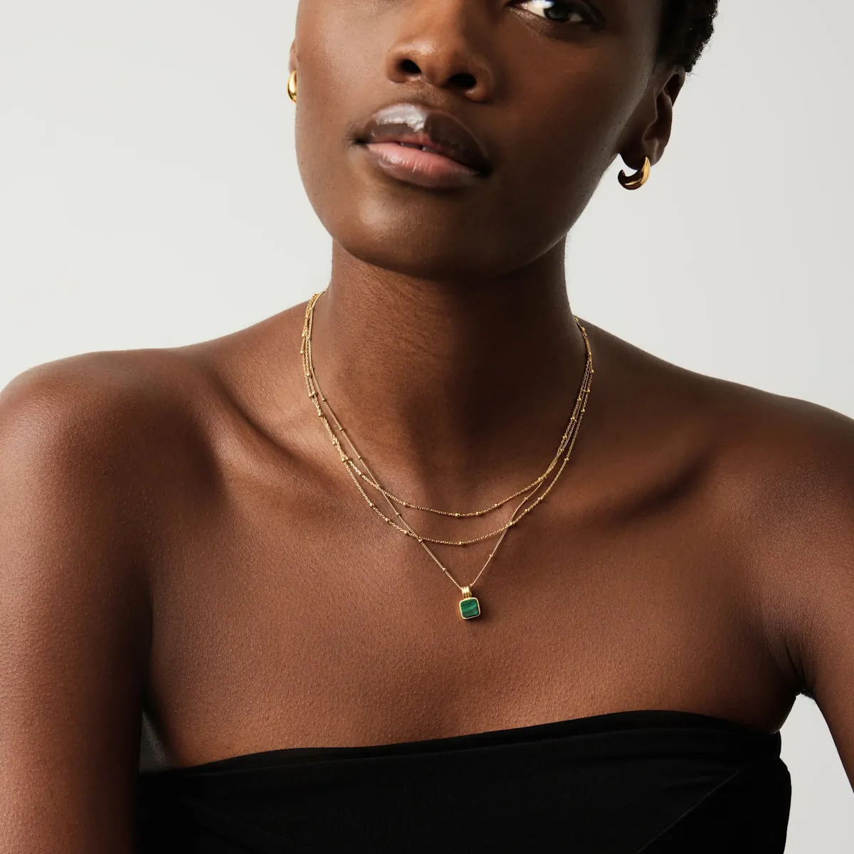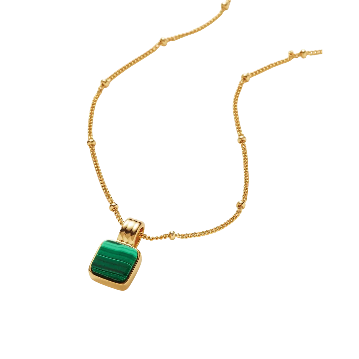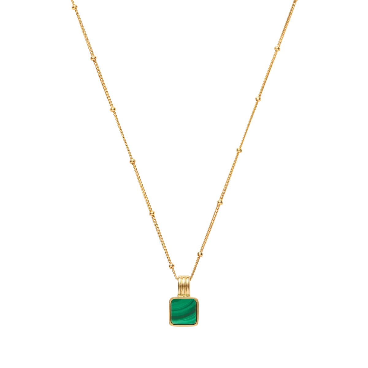 Efni mens og keðju: 18kt gullhjúpað silfur Lengd keðju: 41cm upp í 45cm Steinn: Malakít Stærð mens: 8mm x 8mm