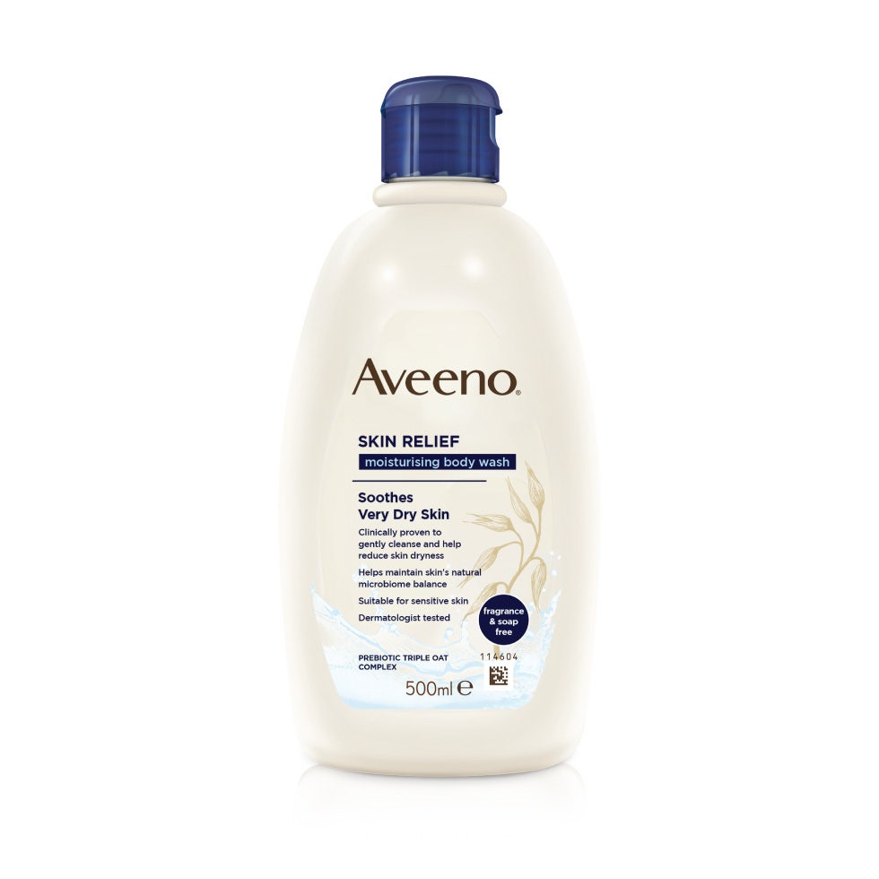 Aveeno Skin Relief sturtugel er milt og sápulaust, það hreinsar og róar þurra, mjög þurra og viðkvæma húð án þess að þurrka hana.
