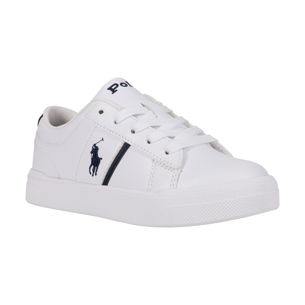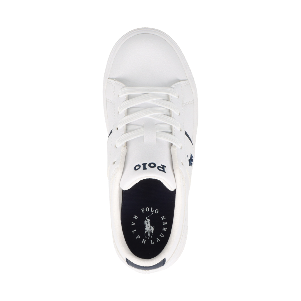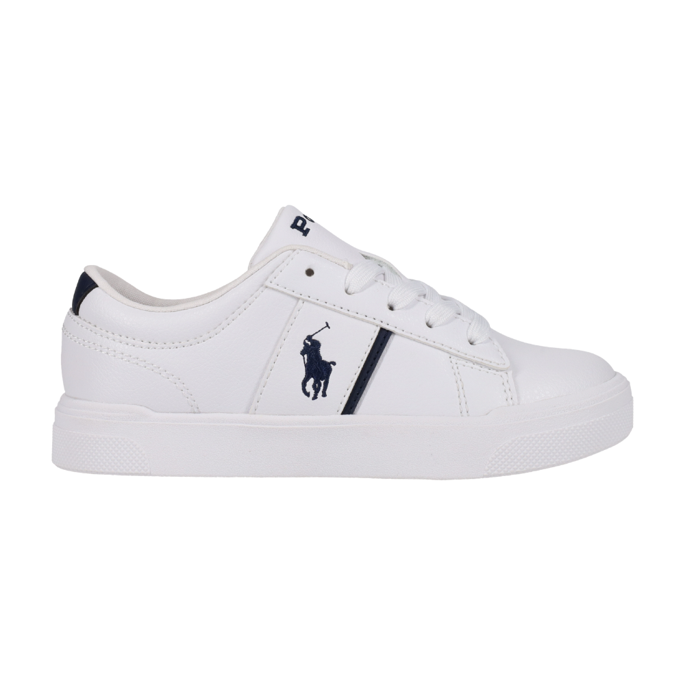 Hvítir logo strigaskór frá Polo Ralph Lauren með dökk bláu, útsaumuðu logo á hliðum.