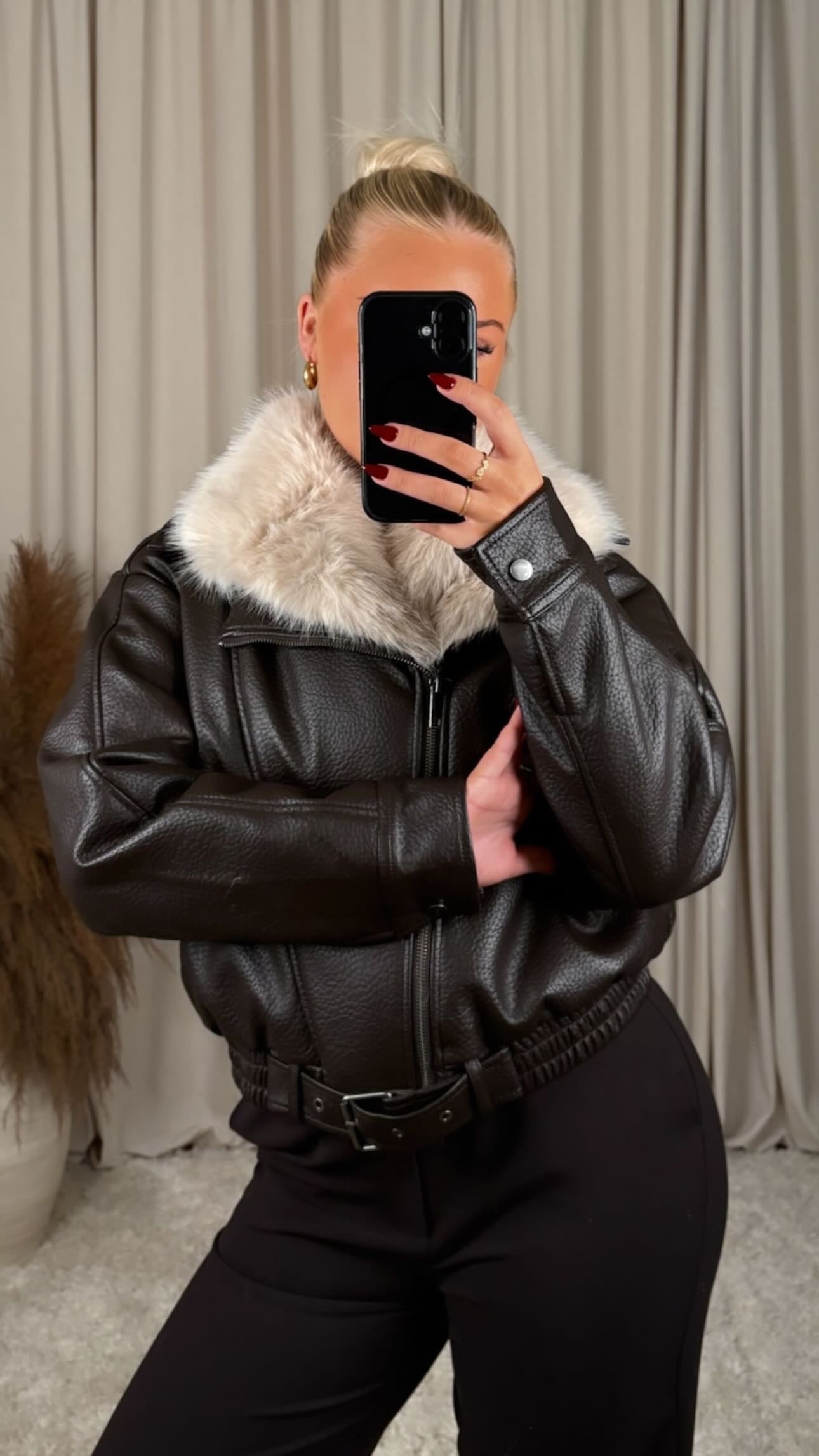 Sjúklega flottur jakki úr hágæða vegan leðri með loð kraga, jakkinn er í true to size modelið er 168cm og er í stærð S