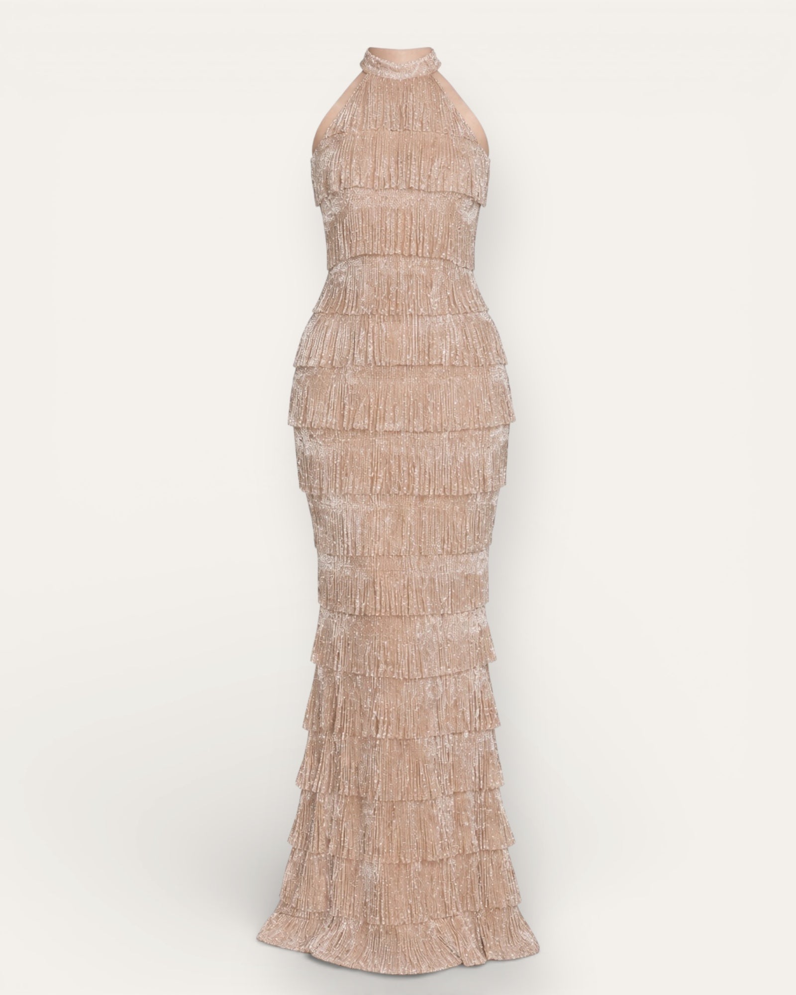 Glæsilegur maxi kjóll með fallegum fringes-lögum sem hreyfast ótrúlega fallega með hverju skrefi. Kjóllinn er með háu hálsmáli að framan og opnu baki með krossuðum böndum sem gefa honum ... Sjá nánar