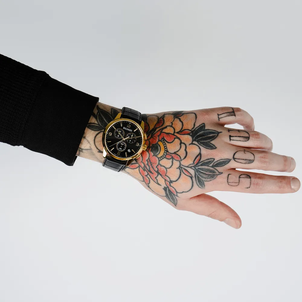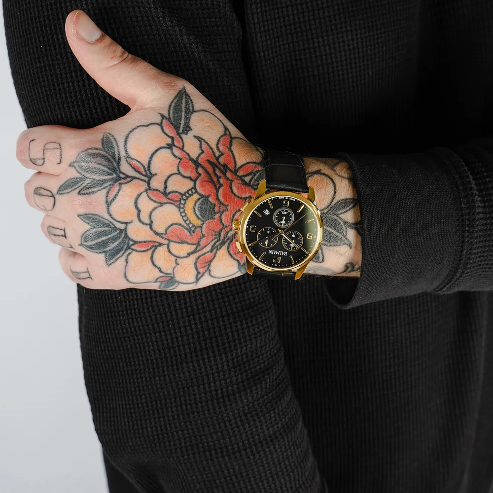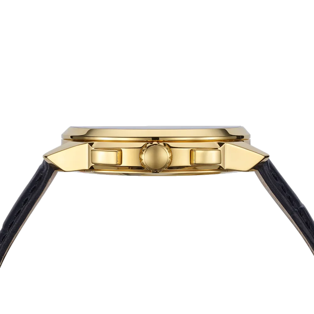 Úrkassi: 42mm – gyllt stál Úrverk: Rafhlaða – skeiðklukka – svissneskt Vatnsvörn: 50M Skífa: Svört – áfest strik – dagsetning hjá kl 4.30 – vísar Gler: Safírgler – speglunarvörn Ól: Leður ... Sjá nánar