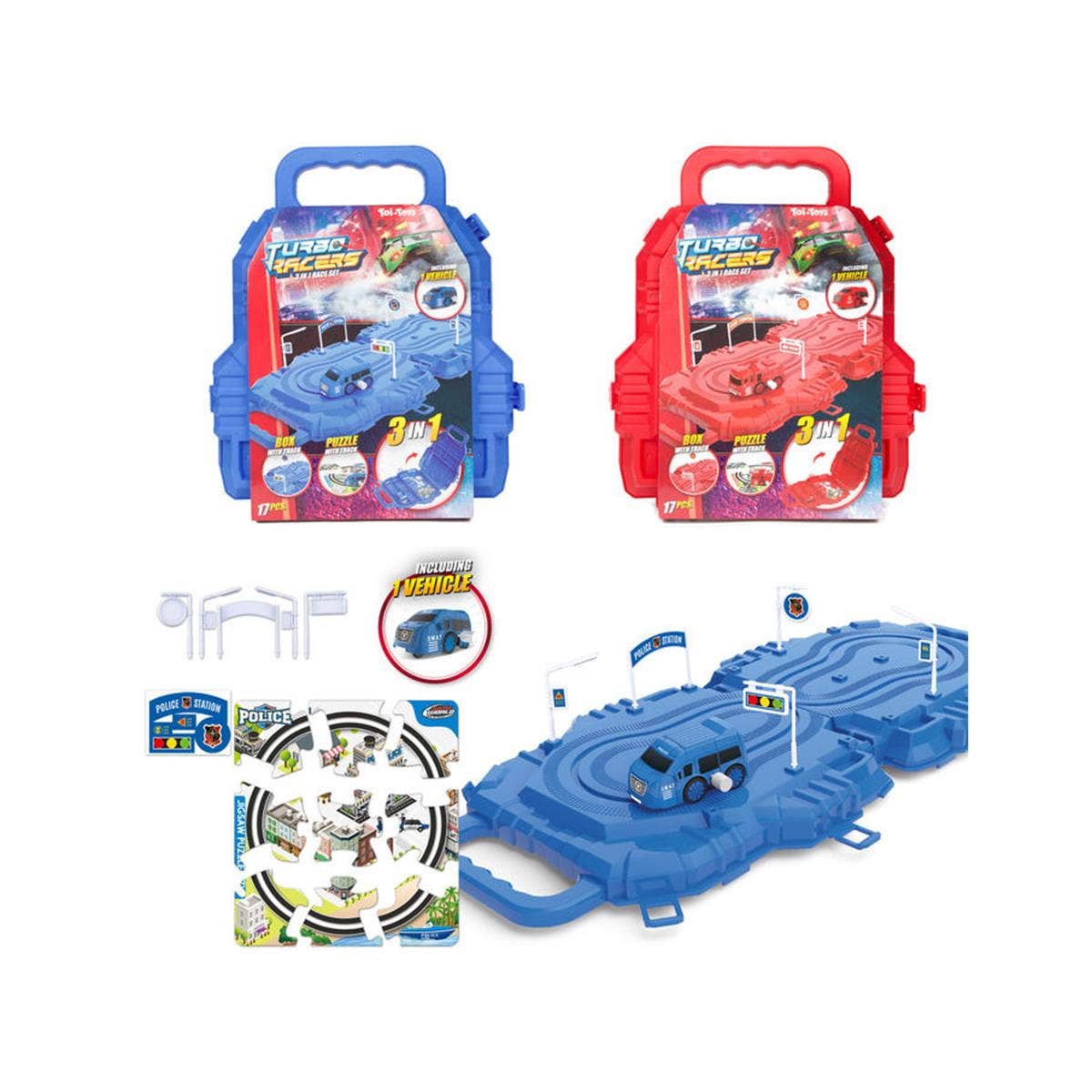 Flott taska sem breytist í bílabraut og inniheldur bíl, fylgihluti og púsl.