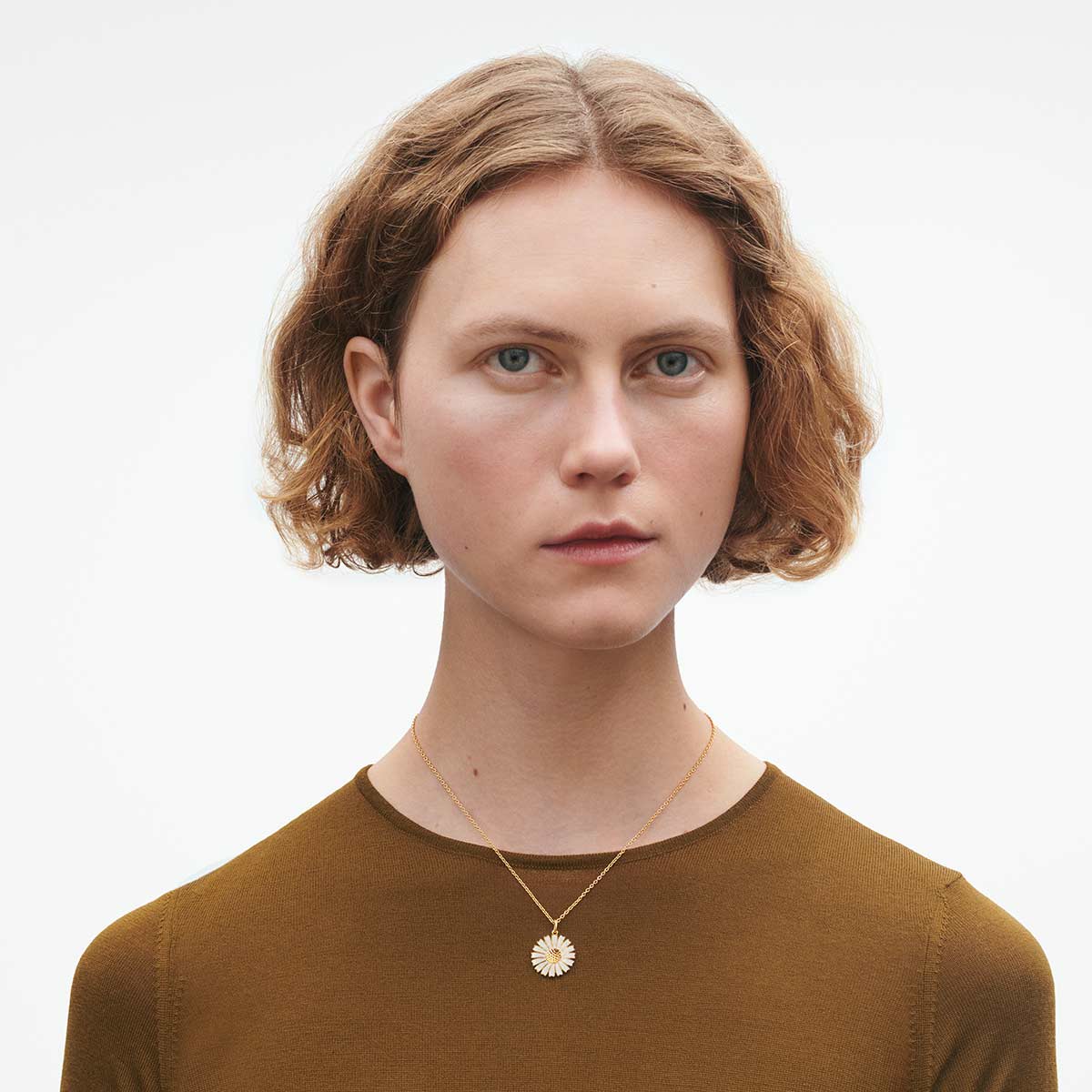 Hálsmenið er frá skartgripalínu Georg Jensen sem kallast Daisy. Menið er úr silfri með 18 karata gullhúð og hvítri emileringu. Þvermál blómsins er 18 mm.  Lengd festarinnar er stillanleg frá ... Sjá nánar