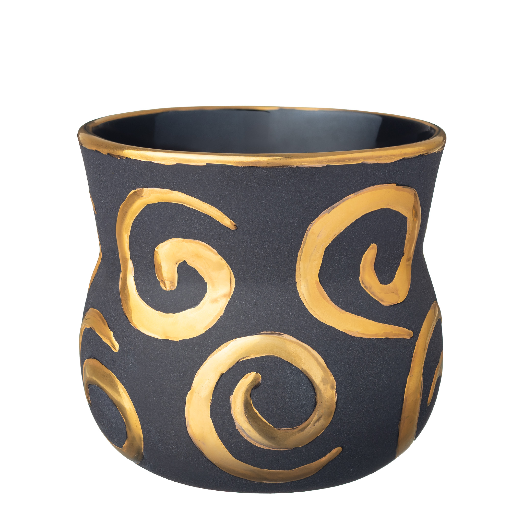 Handgerður Veltibolli úr svörtu postulíni, málaður með þykkri 24 karata gyllingu og þolir því ekki uppþvottavélar og örbylgjuofna. Bollinn hefur þann eiginleika að hitna ekki efst þegar hellt ... Sjá nánar