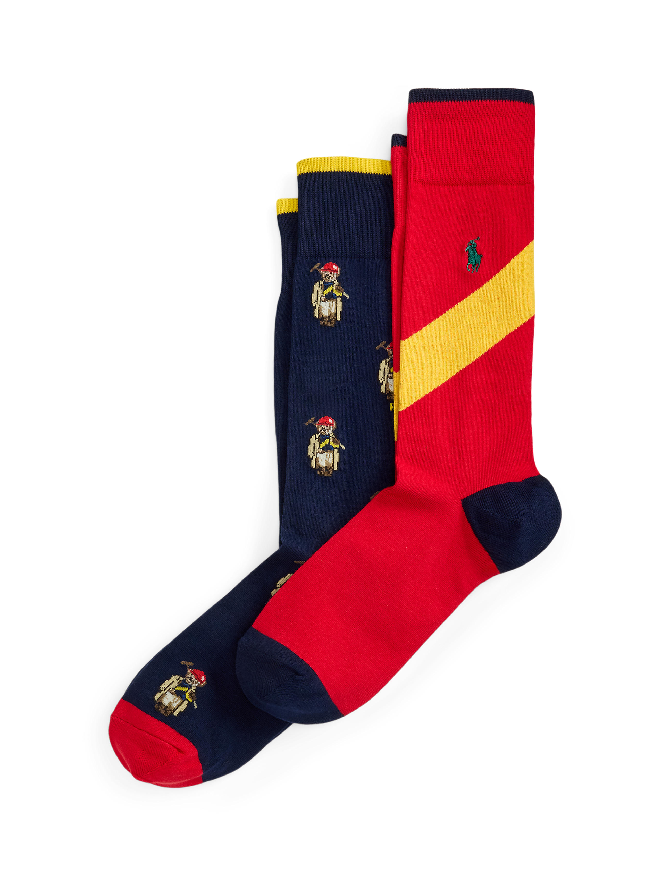 The equestrian-inspired trouser socks in this two-pack feature an allover pattern of our Polo Bear and a bold sash-stripe design. Made from a soft cotton blend, they are finished with ... Sjá nánar