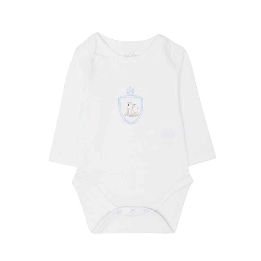 Hvít samfella með mynd að framan frá sænska merkinu Livly. Samfellan er úr hágæða, lífrænni Pima bómull. 100% Pima bómull.