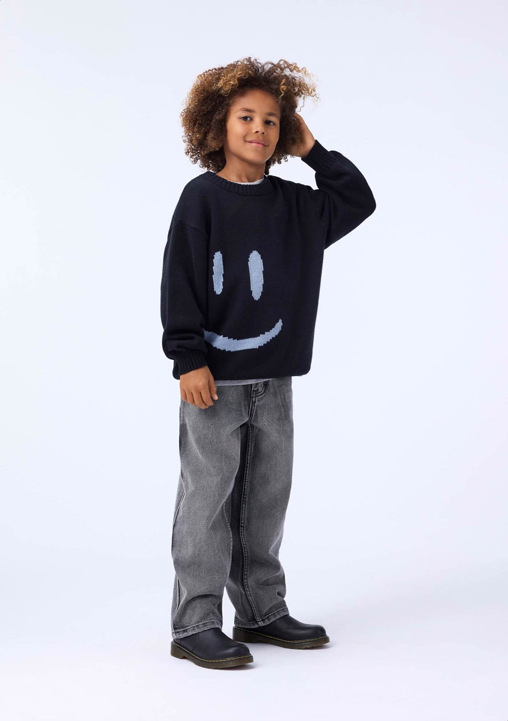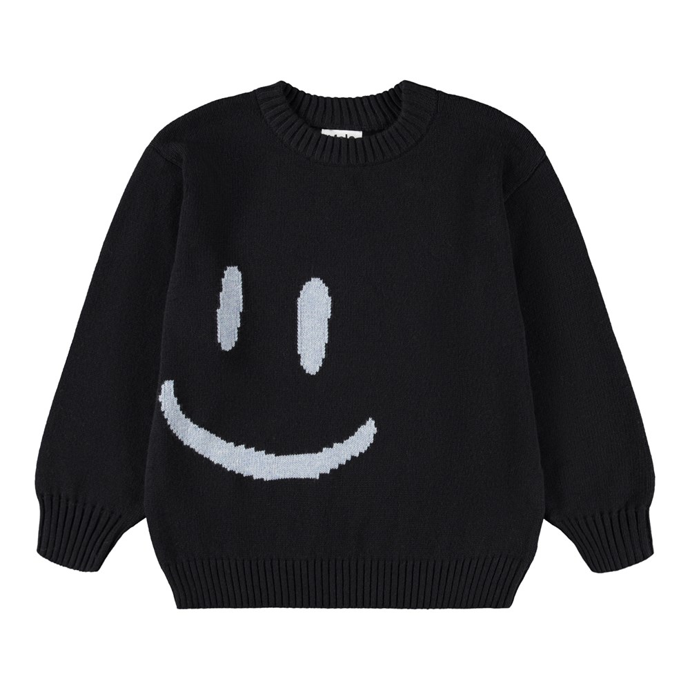 Svört prjónapeysa frá Molo með broskalli að framan og aftan. 80% bómull og 20% ull.