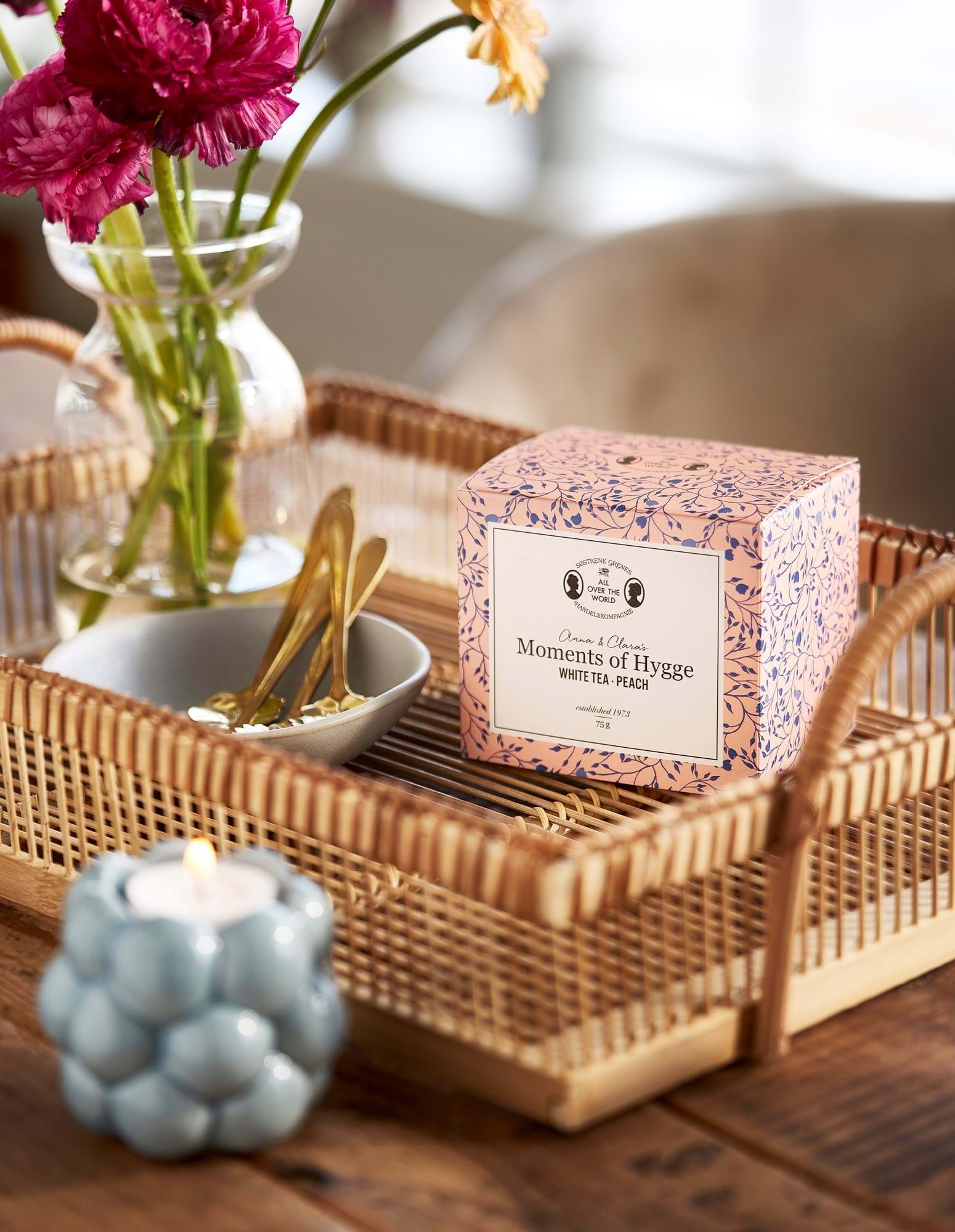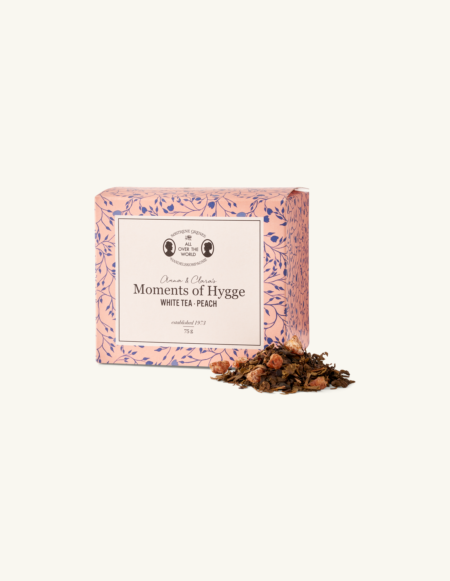 Moments of 'Hygge' Anna and Clara's Moments of Hygge white tea with peach flavour is a lovely and refreshing tea with 95% white tea, 2% peach, and 3% peach flavour. It comes in a beautiful box ... Sjá nánar