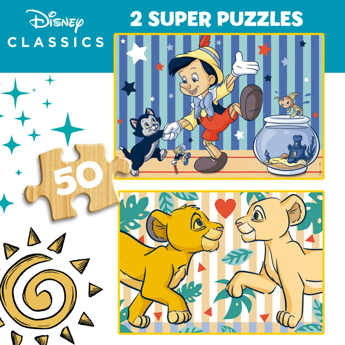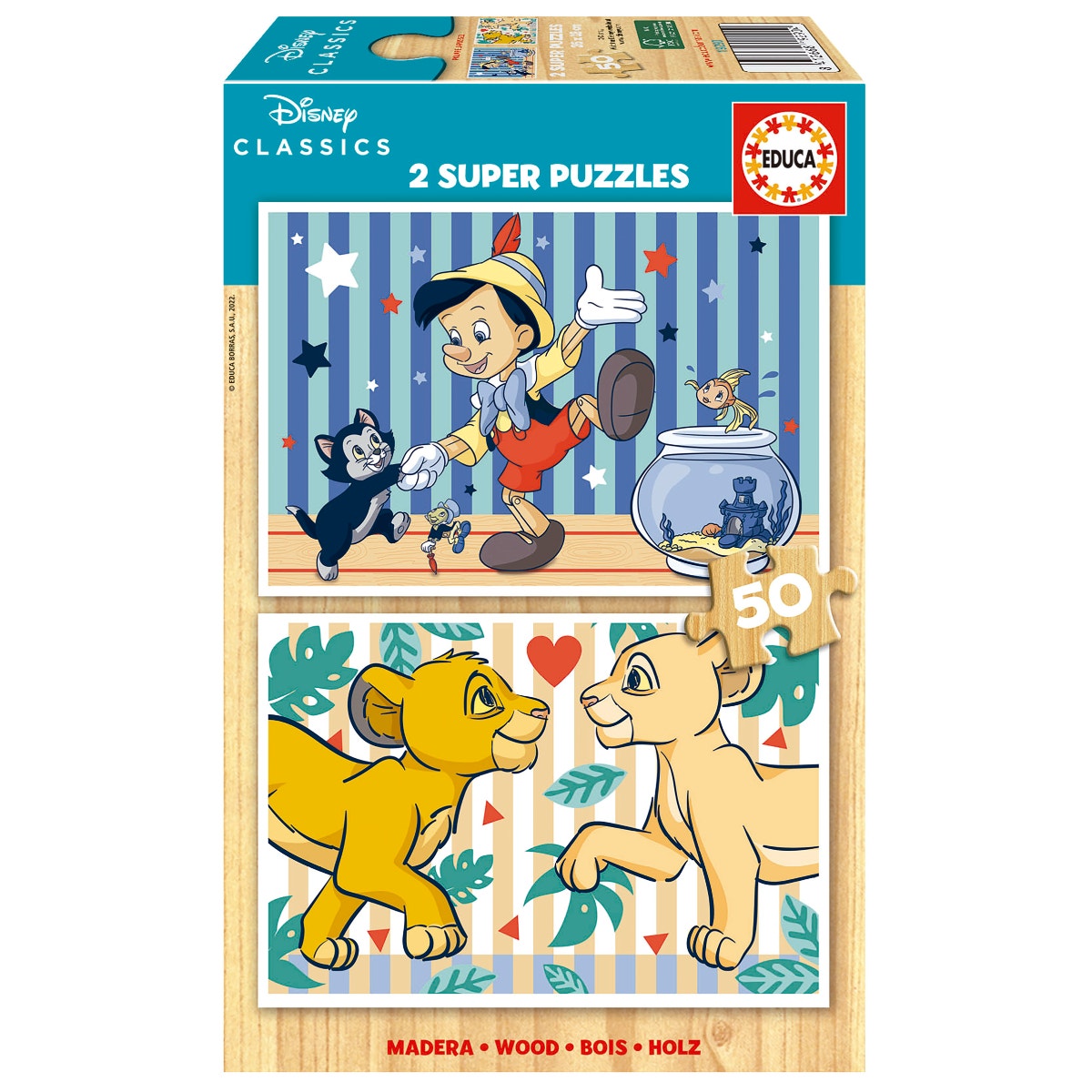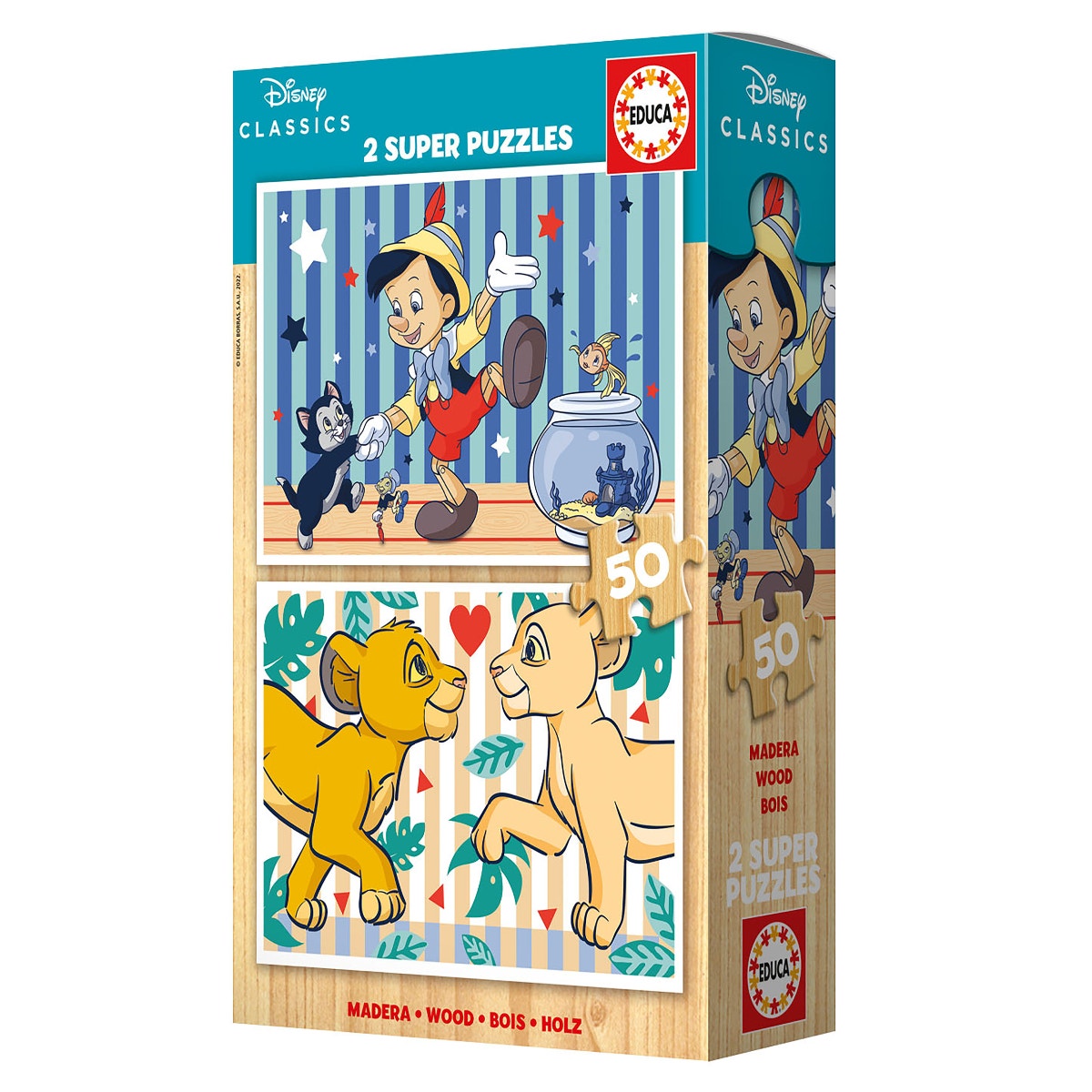 Sætt púslsett frá Educa sem inniheldur tvenn 50 bita púsl með myndum af Disney persónum úr myndunum Gosa og Konungi Ljónanna. Púslbitarnir eru úr viði og púsluð stærð er 26 x 18 cm.