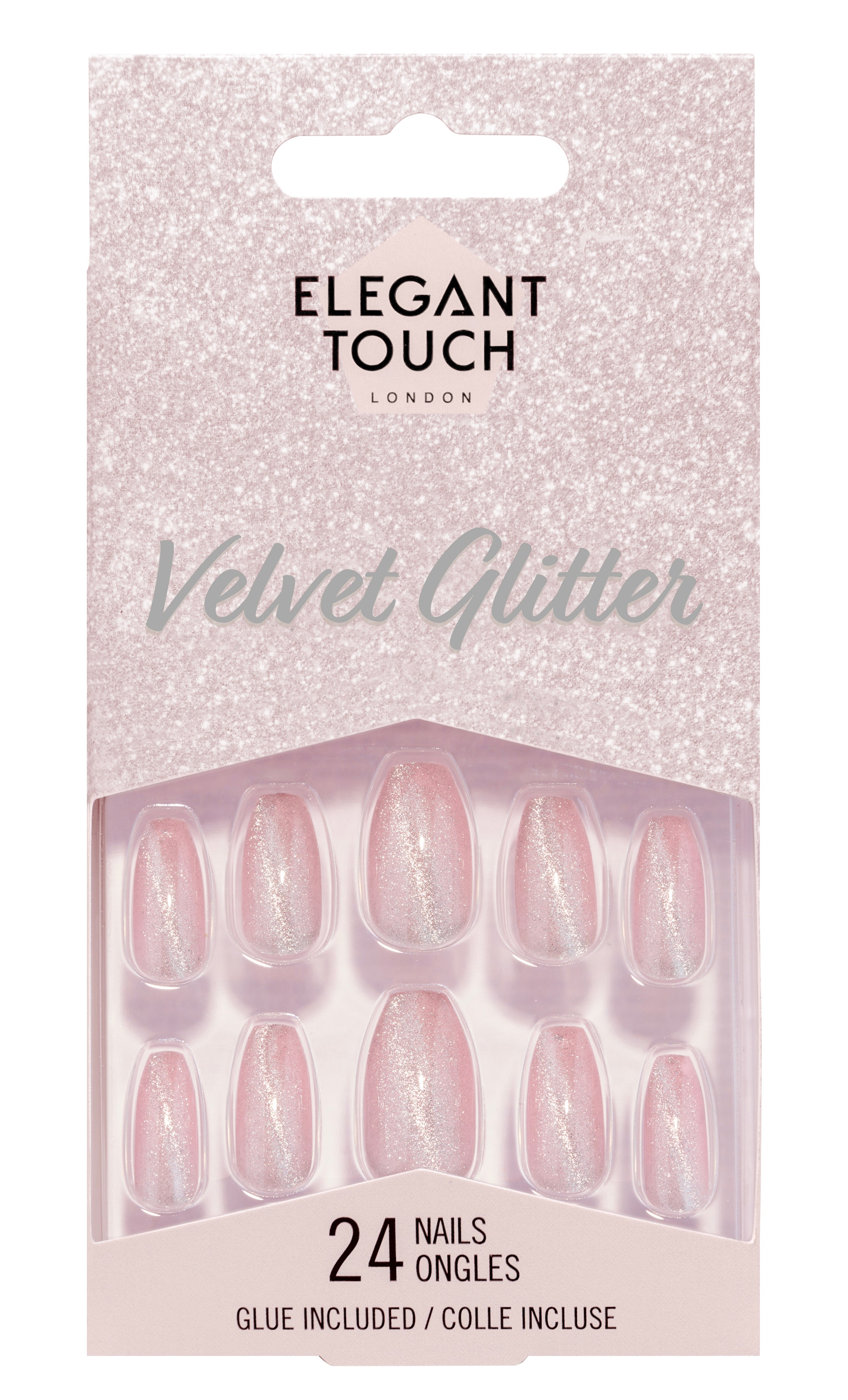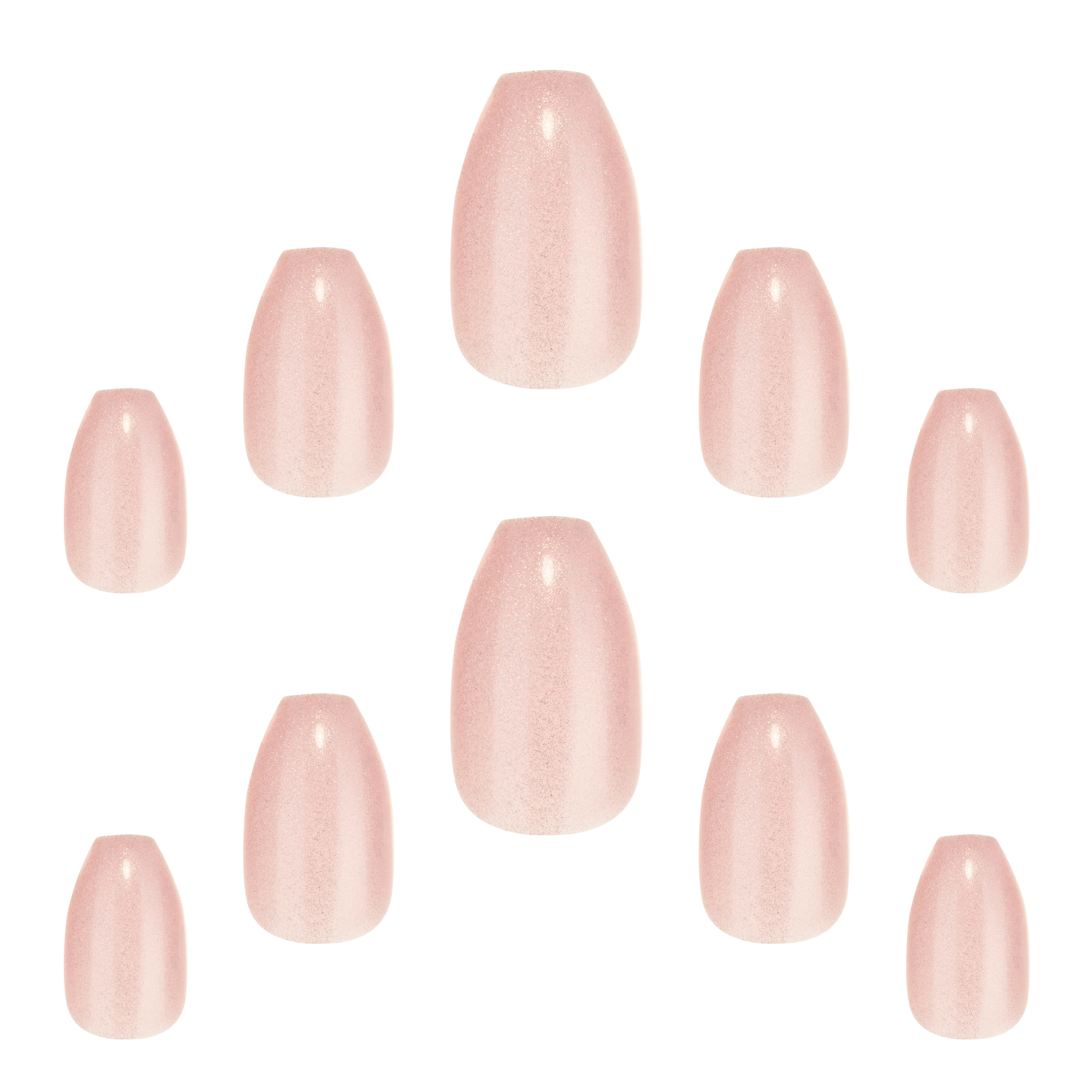 Glitter Celestial frá Elegant Touch eru töfrandi fallegar neglur með bleiku glimmeri. Neglurnar eru með coffin lögun, þar sem neglurnar eru aðeins mjórri að framan en með flatri hlið.