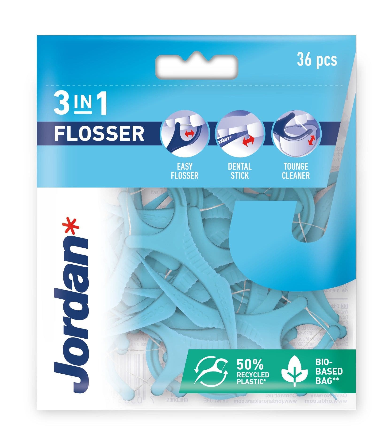 Tannþráður, tunguskafa og tannstöngull í einni vöru.