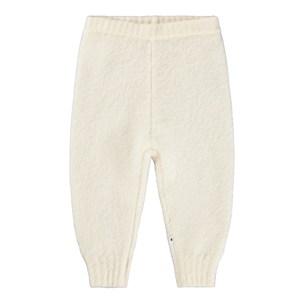 Ljósar ullarbuxur frá Molo með teygju í mittið. 34% alpaca ull, 34% ull, 27% polyester og 5% EA.