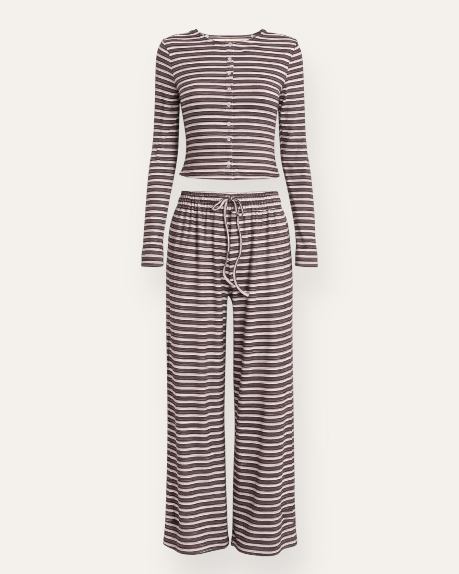 Röndótt Sett – Peysa & Buxur Þægilegt og stílhreint sett sem samanstendur af síerma peysu með tölum að framan og víðum buxum með teygju og bandi í mitti. Mjúkt og teygjanlegt efni gerir ... Sjá nánar