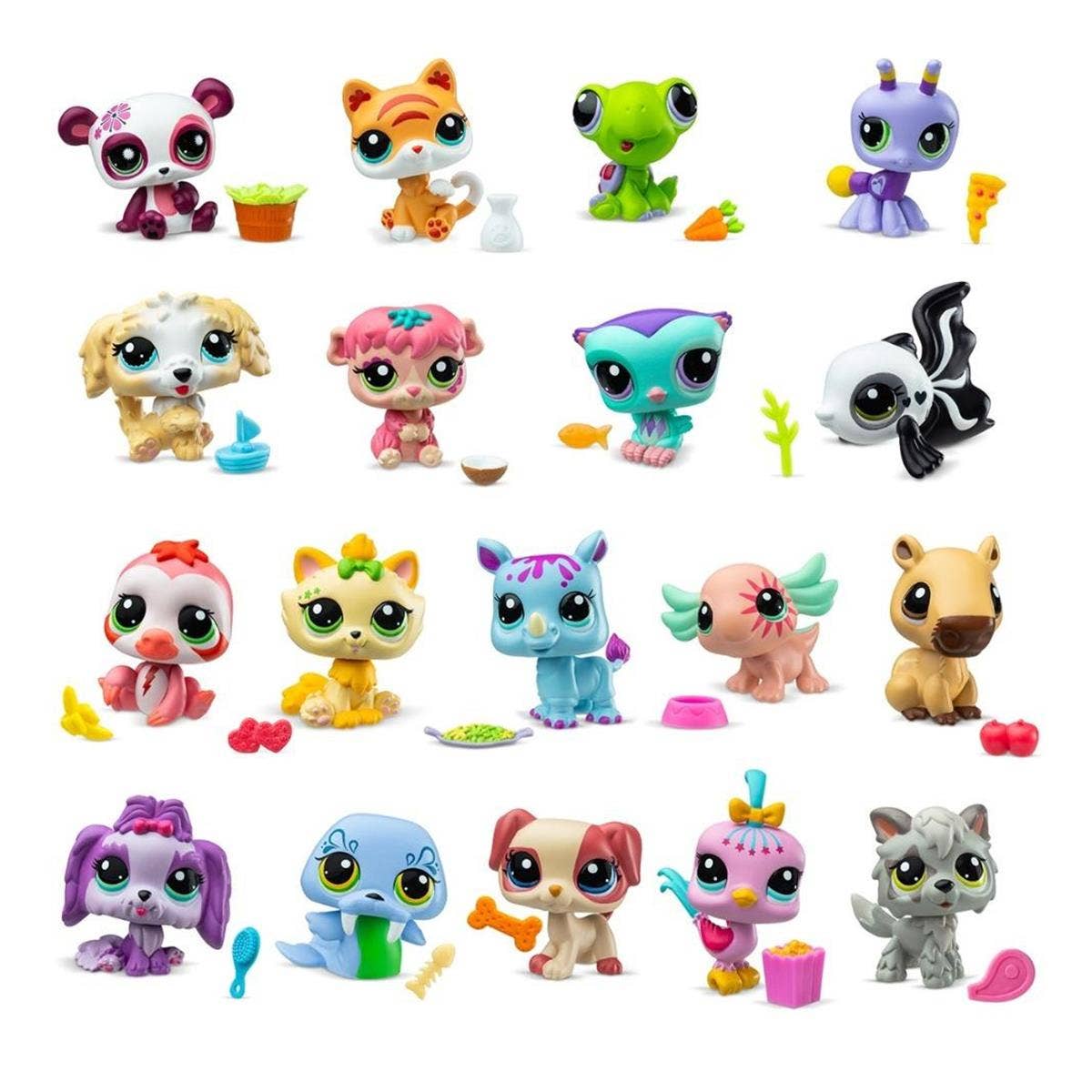 Sett með sætu litlu gæludýri, mat eða fylgihluti og safnspjaldi.