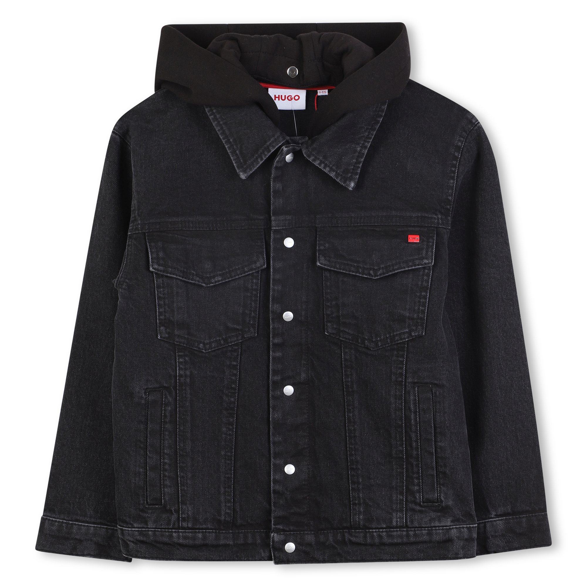 Svartur gallajakki með hettu frá Hugo. 100% bómull.