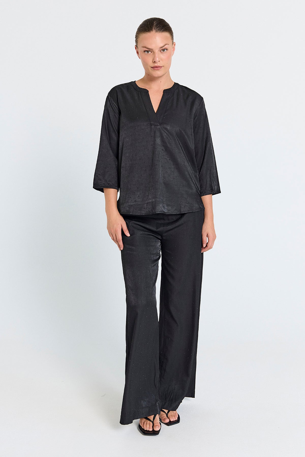 Æðislega fallegar buxur frá Free/Quent með léttri satín áferð og svörtum litlum steinum á. 70%viscose 30%polyester