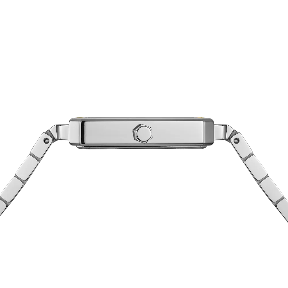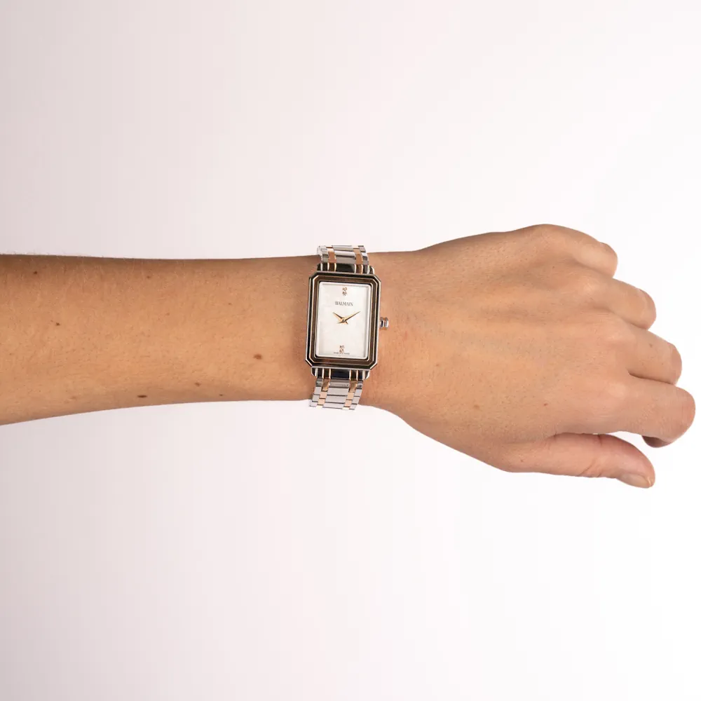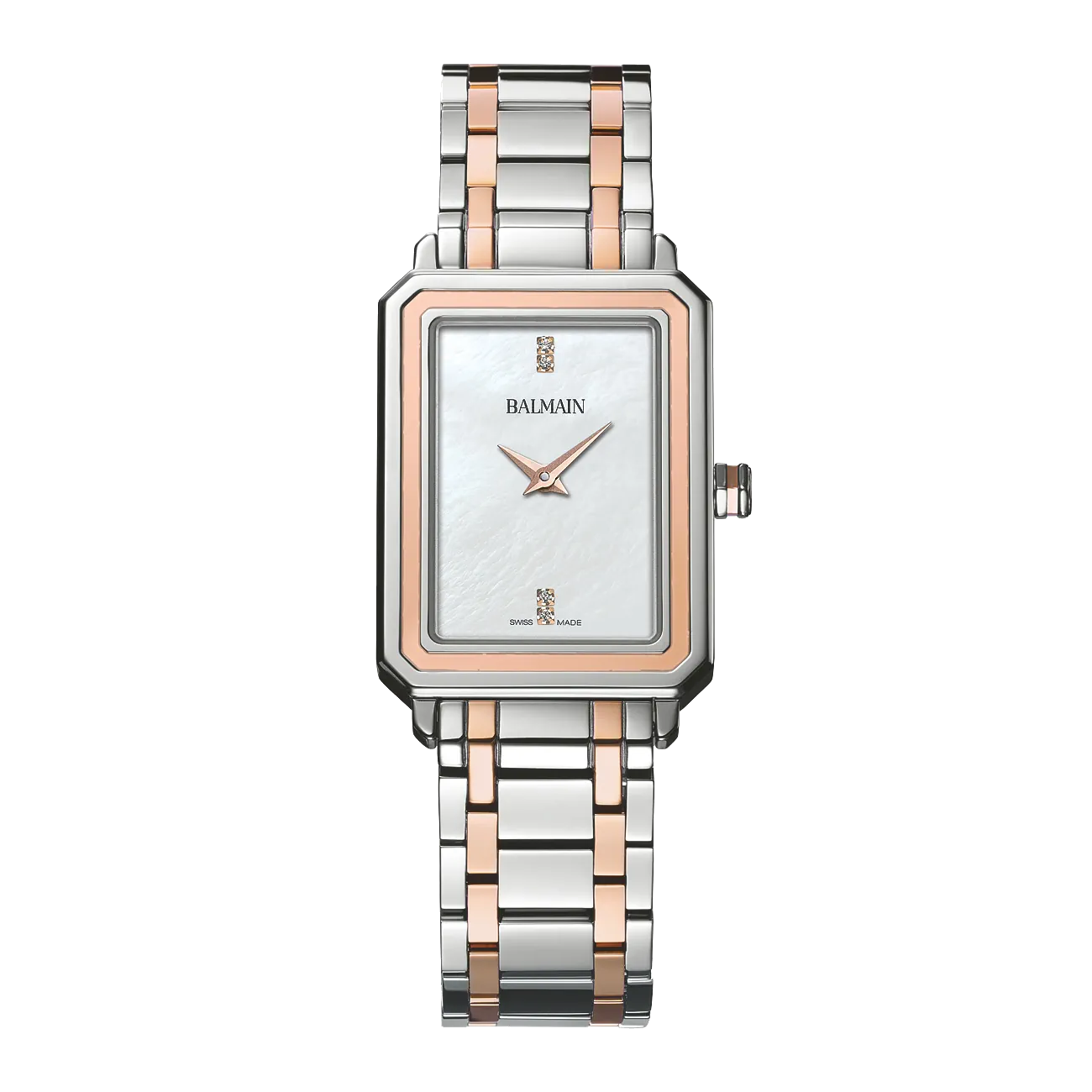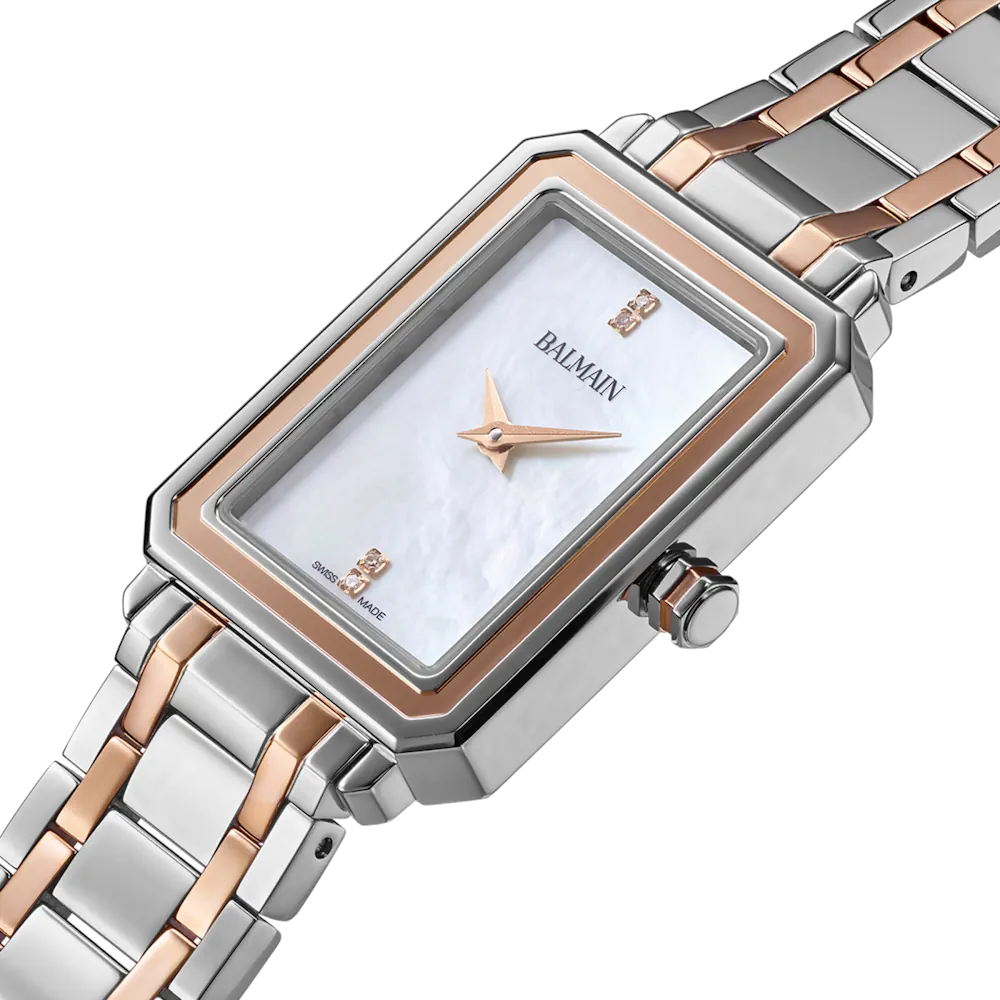 Úrkassi: 25 x 33mm – stál & rauðagyllt stál Úrverk: Rafhlaða – svissneskt Vatnsvörn: 30M Skífa: Hvít perlumóðir – 4 demantar (Top Wesselton VS-SI – 0,014ct) – vísar Gler: Safírgler – ... Sjá nánar
