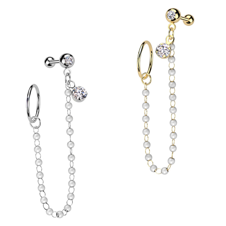 Lokkur yfir í smelluhring með steinum og perlu keðju á milli.  Lokkurinn er gerður úr 316L Surgical Steel og PVD húðaður.  Passar í t.d. eyrnasnepla og fl. Keðja uþb. 63mm Breidd á pinna 1.0mm ... Sjá nánar