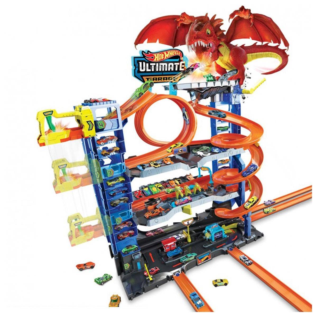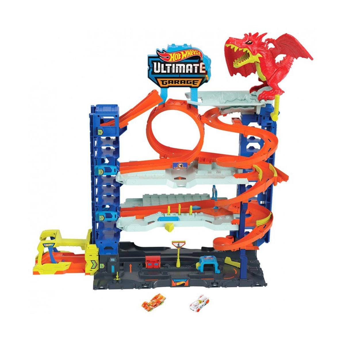 Glæsilegt bílastæðahús með dreka og keppnisbraut fyrir Hot Wheels smábíla.