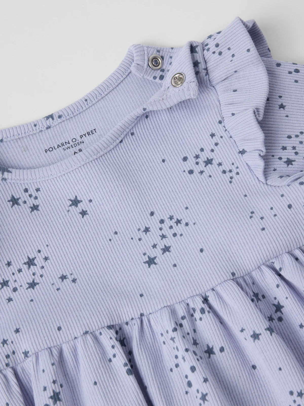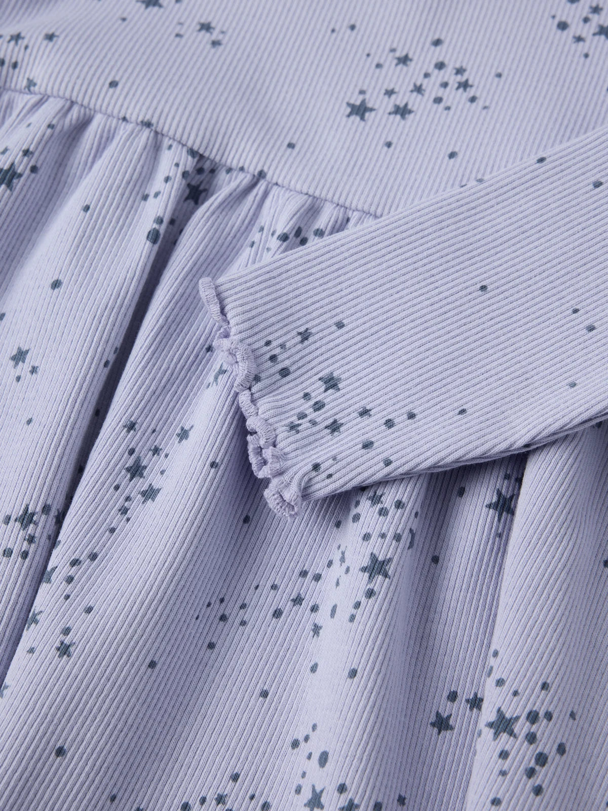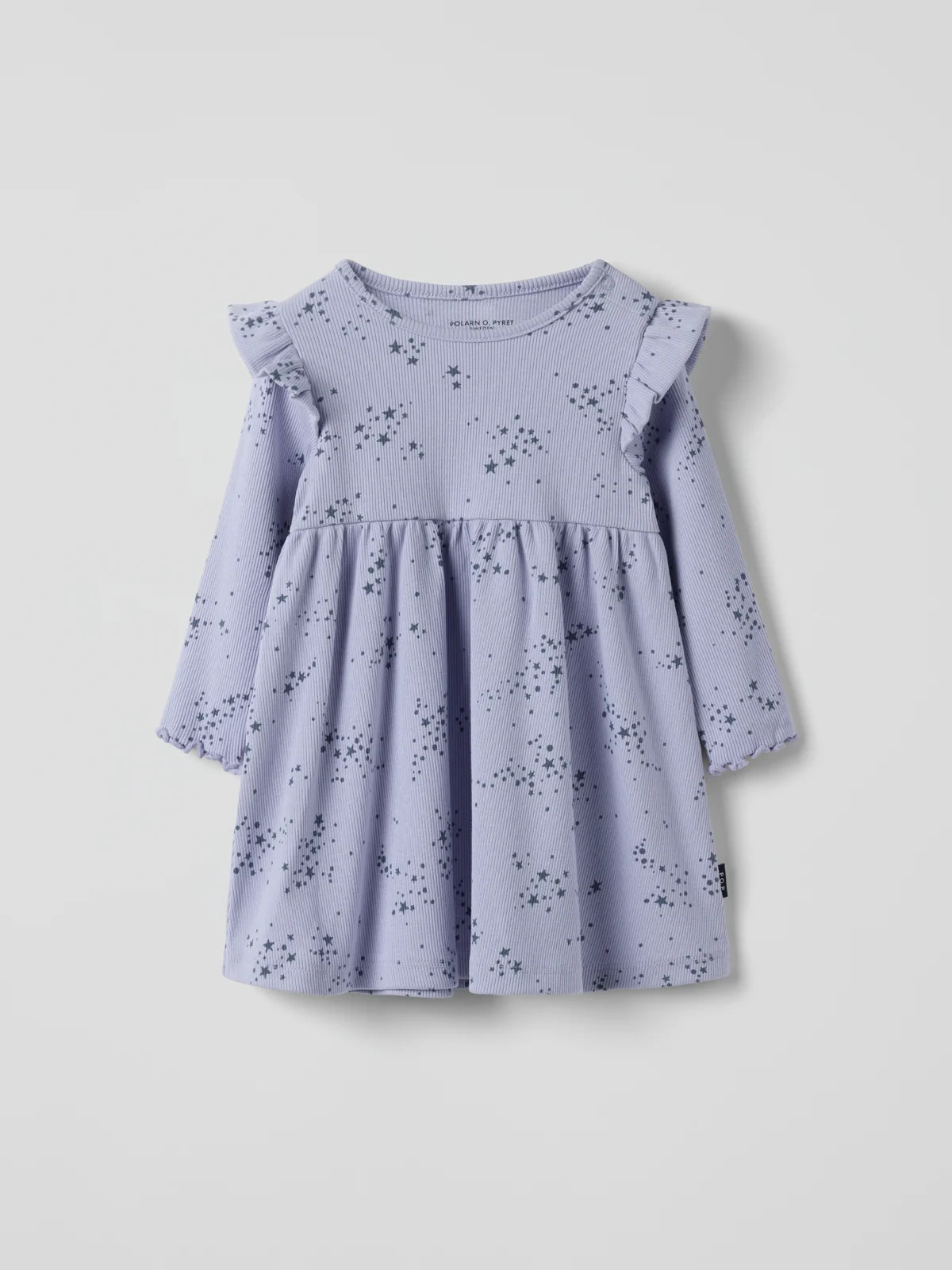 Ribbed dress stars Ribbed, with soft ruffles Soft ribbed baby dress in organic cotton. The dress is all-over printed and decorated with delicate ruffles at the shoulders. Size 86–92 has a ... Sjá nánar