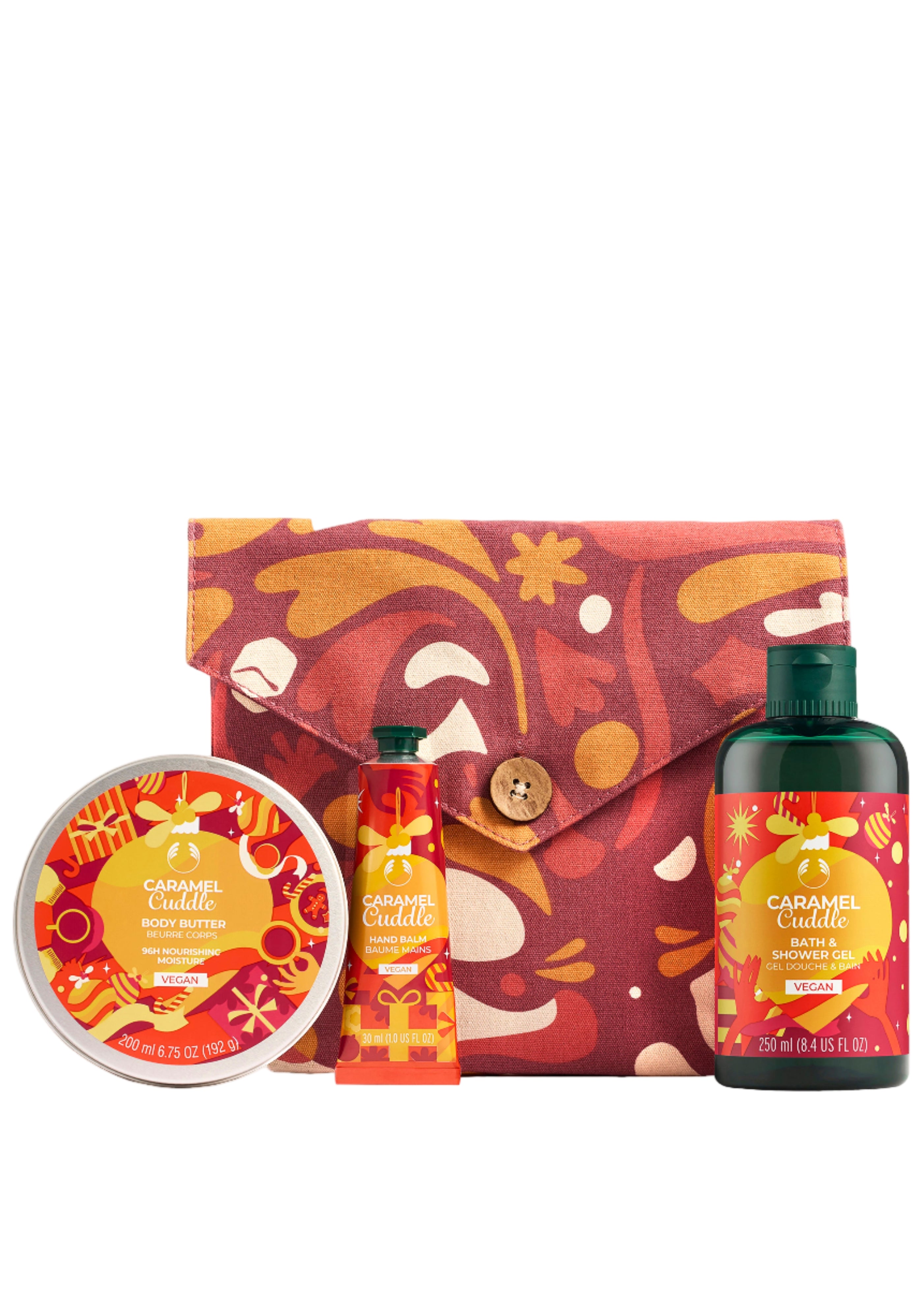 Sæt gjöf í fallegum gjafapoka.  Sturtusápa, Body Butter og handáburður úr Caramel Cuddle baðlínunni.   Yndislegur sætur ilmur af saltaðri karamellu, vanillu og tonkabaun, blandað fersku ... Sjá nánar
