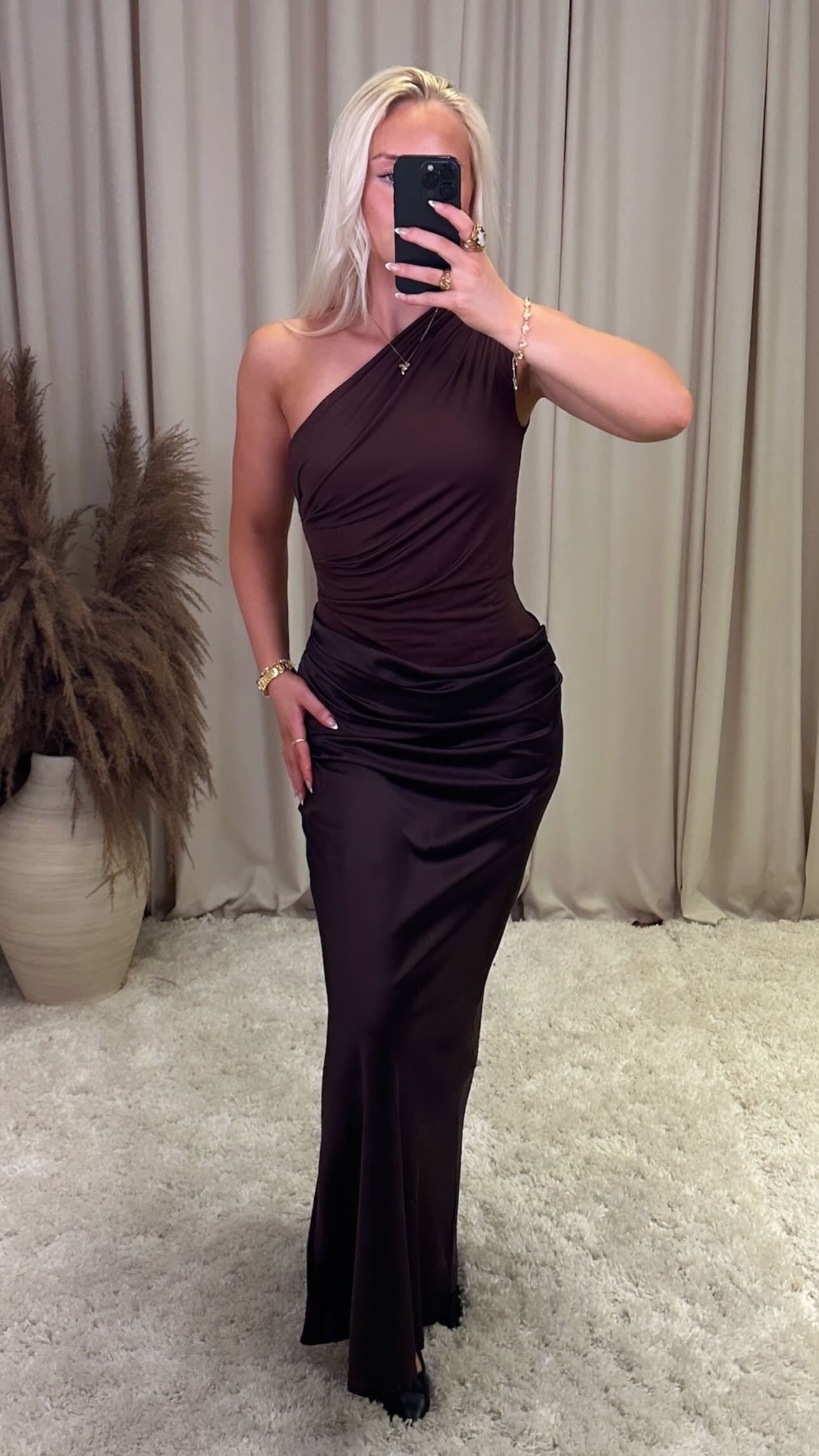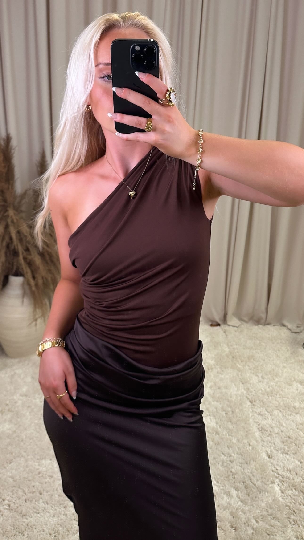 Æðislega fallegur one shoulder kjóll úr mjög þæginlegu efni, það er smá teygja í efninu  módelið er 160cm og er í stærð S