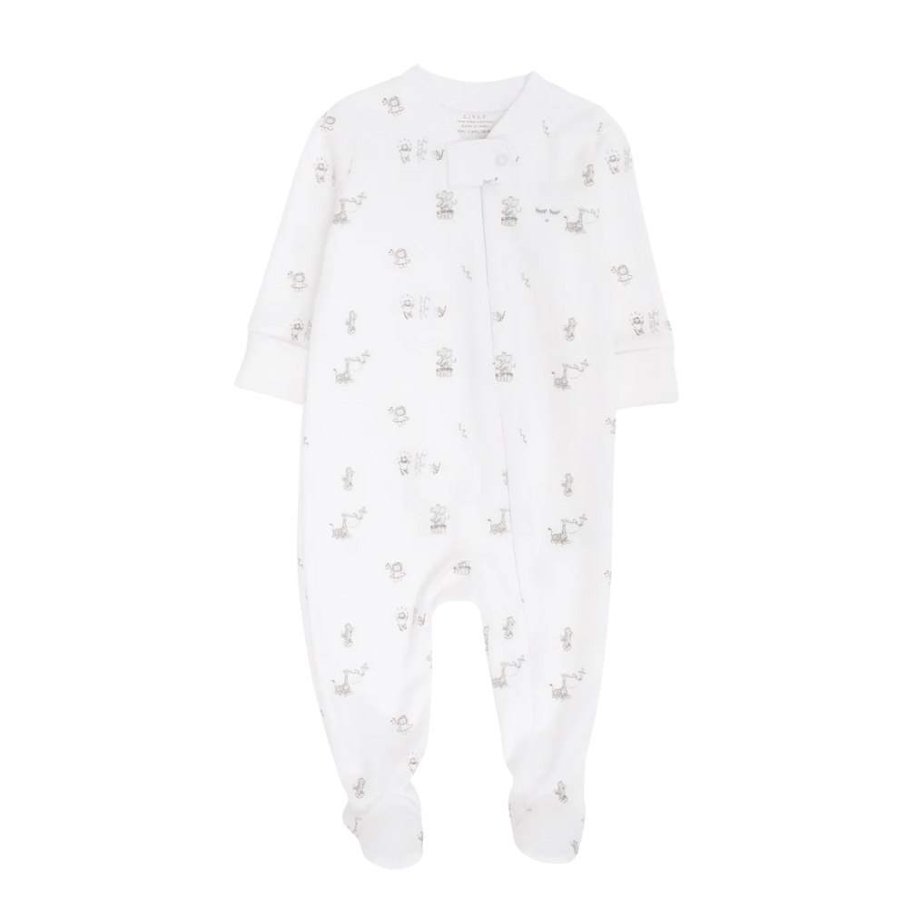 Mjúkur, hvítur heilgalli með kraga frá sænska merkinu Livly. Gallinn er skreyttur fallegu mynstri í bláum lit. Gallinn er renndur að framan og með áföstum sokkum. 100% pima bómull.