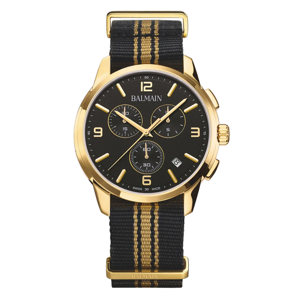 Úrkassi: 42mm – gyllt stál Úrverk: Rafhlaða – skeiðklukka – svissneskt Vatnsvörn: 50M Skífa: Svört – áfest strik – dagsetning hjá kl 4.30 – vísar Gler: Safírgler – speglunarvörn Ól: Textílefni ... Sjá nánar