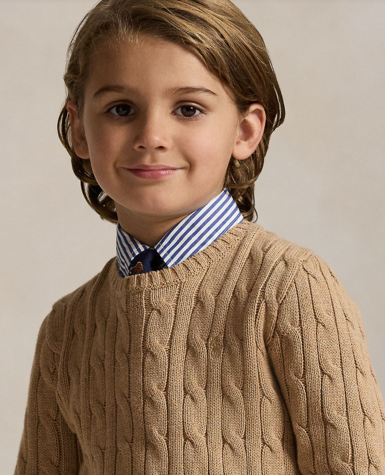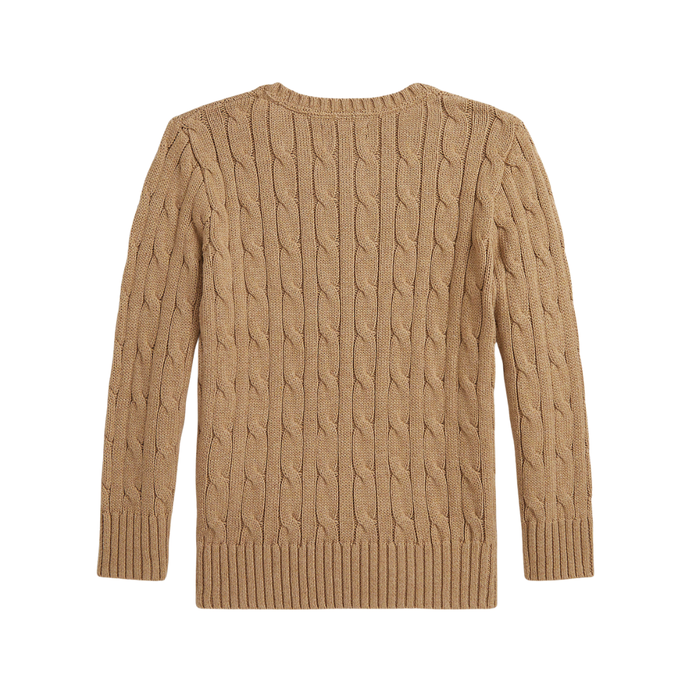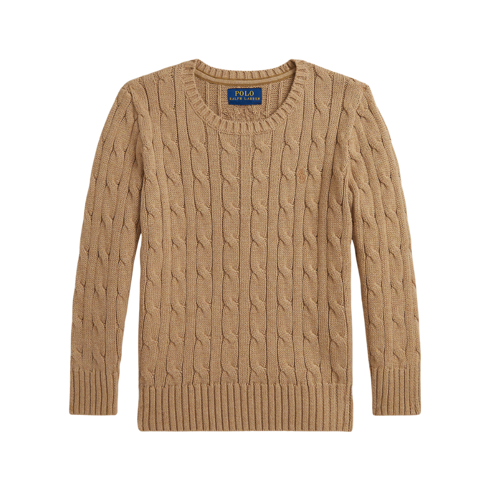 Brún kaðlapeysa frá Ralph Lauren með rúnuðu hálsmáli og útsaumuðu logo vinstra megin að framan. 100% bómull.
