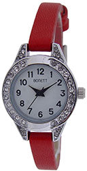 Barnaúr - Bonett Vr:1459R Þvermál skífu: 23mm Hvít skífa rauð ól Úrkassi: Stál með hvítum steinum quarts verk 2 ára ábyrgð á úrverki og 1 árs ábyrgð á rafhlöðu