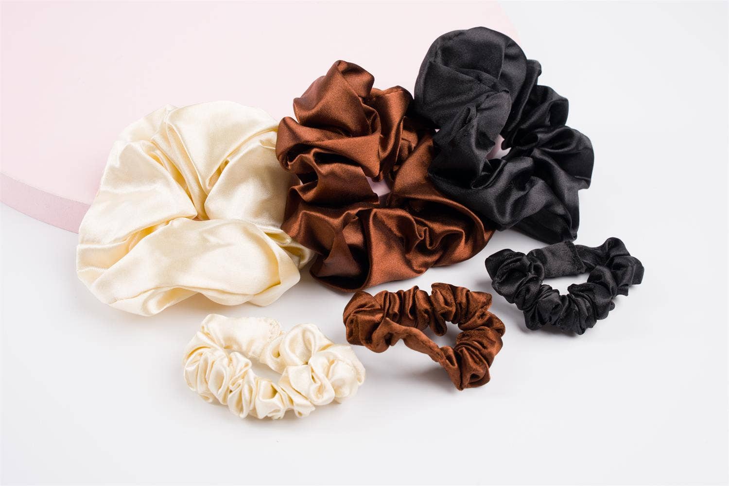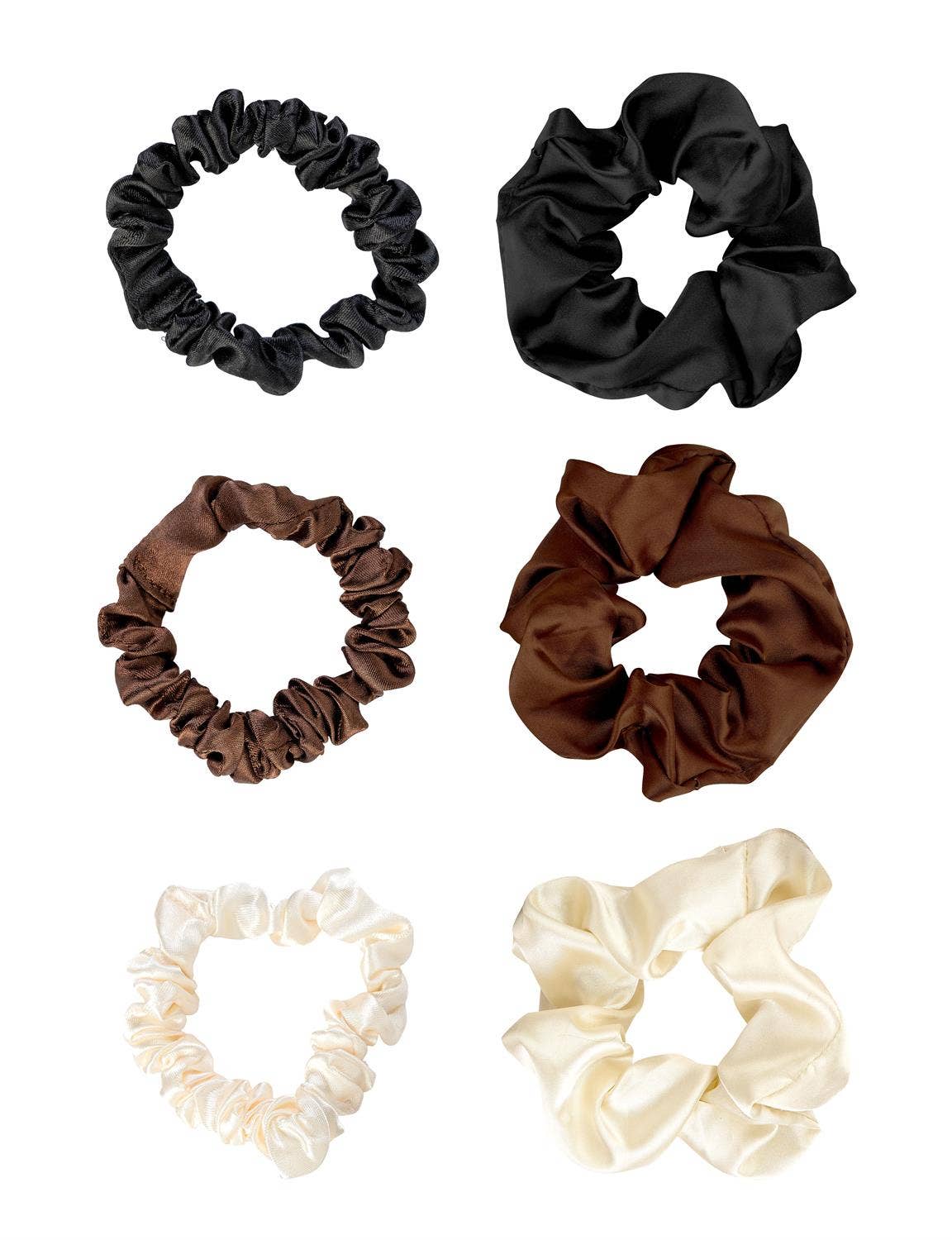 Mjúkar satínhárteygjur í hlutlausum litum – fallegar, þægilegar og mildar við hárið. 6 í setti, vegan og ekki prufað á dýrum.