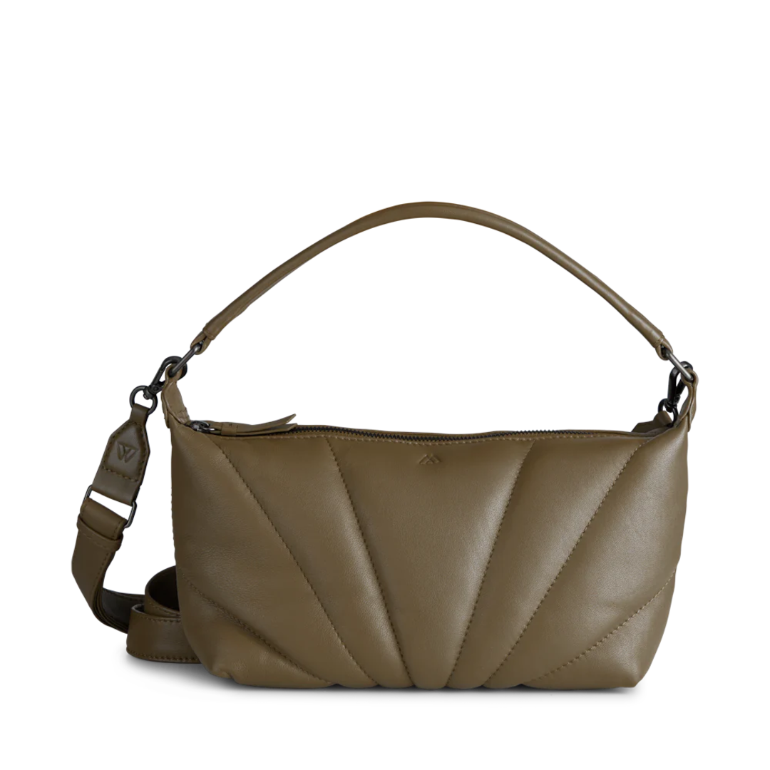 Puffer lookSmall zip pocket insideLarge compartmentCloses with a zip.Shoulder strapDetachable and adjustable crossbody strapMATERIALSSheep leather100% cotton liningCOLORMossHEIGHT20 cmWIDTH 32 ... Sjá nánar