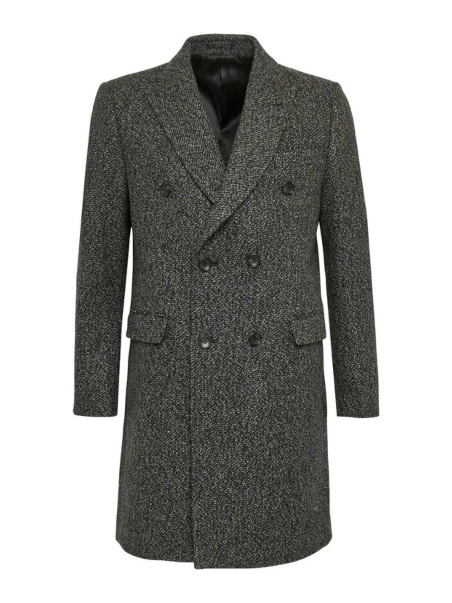 Front closure with buttons Double breasted Flap pockets on side Fully lined Grey and black yarns in a structured tweed weave 60% Wool 30% Polyester 10% Other Fibers