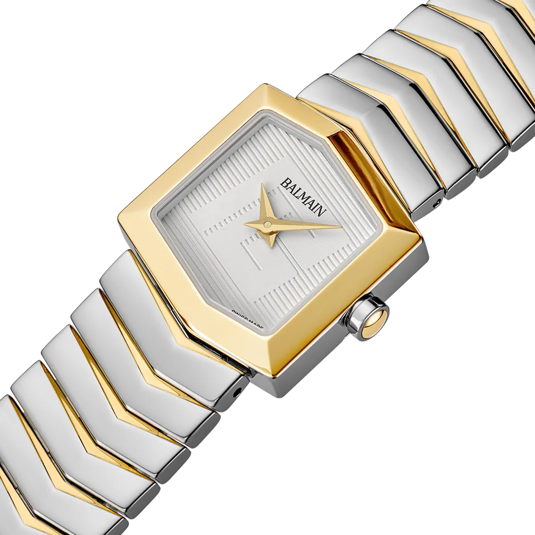 Úrkassi: 22,5mm – stál & gyllt stál Úrverk: Rafhlaða – svissneskt Vatnsvörn: 30M Skífa: Hvít með PB Balmain logoi – vísar Gler: Safírgler – speglunarvörn Keðja: Stál & gyllt stál - öryggislás ... Sjá nánar
