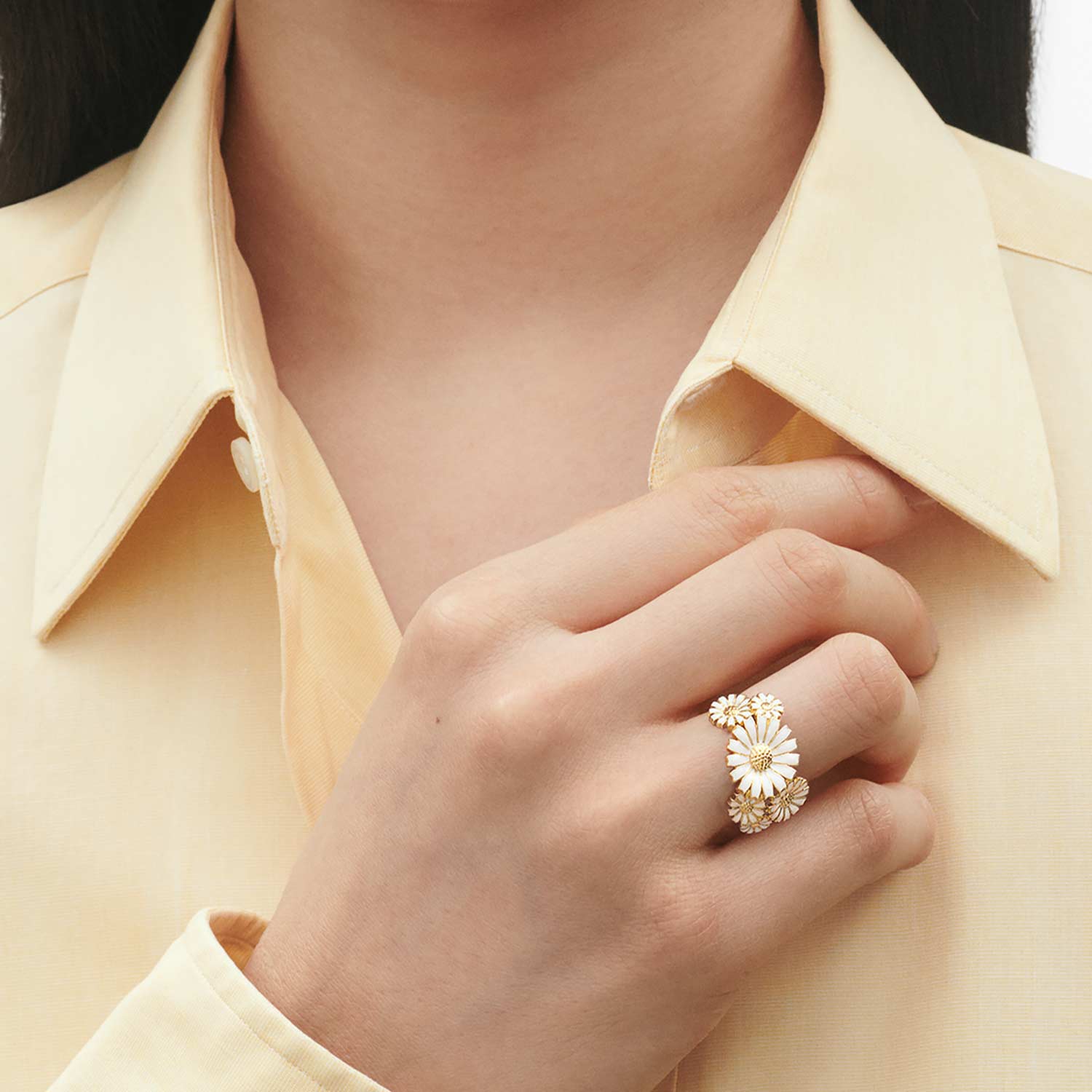 Hringurinn er úr skartgripalínu Daisy frá Georg Jensen. Blómið hefur verið einkennandi fyrir Georg Jensen frá árinu 1940, en fatahönnuðurinn Stine Goya endurhannaði hringinn árið 2024. ... Sjá nánar