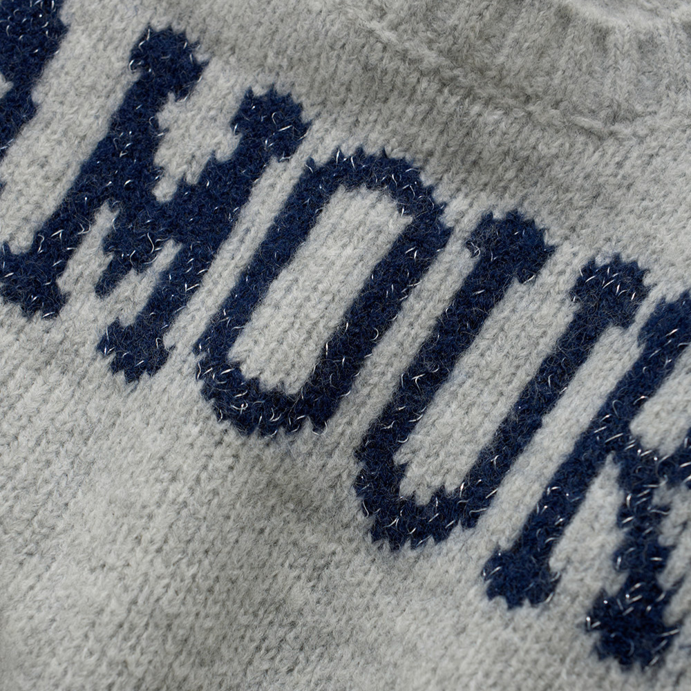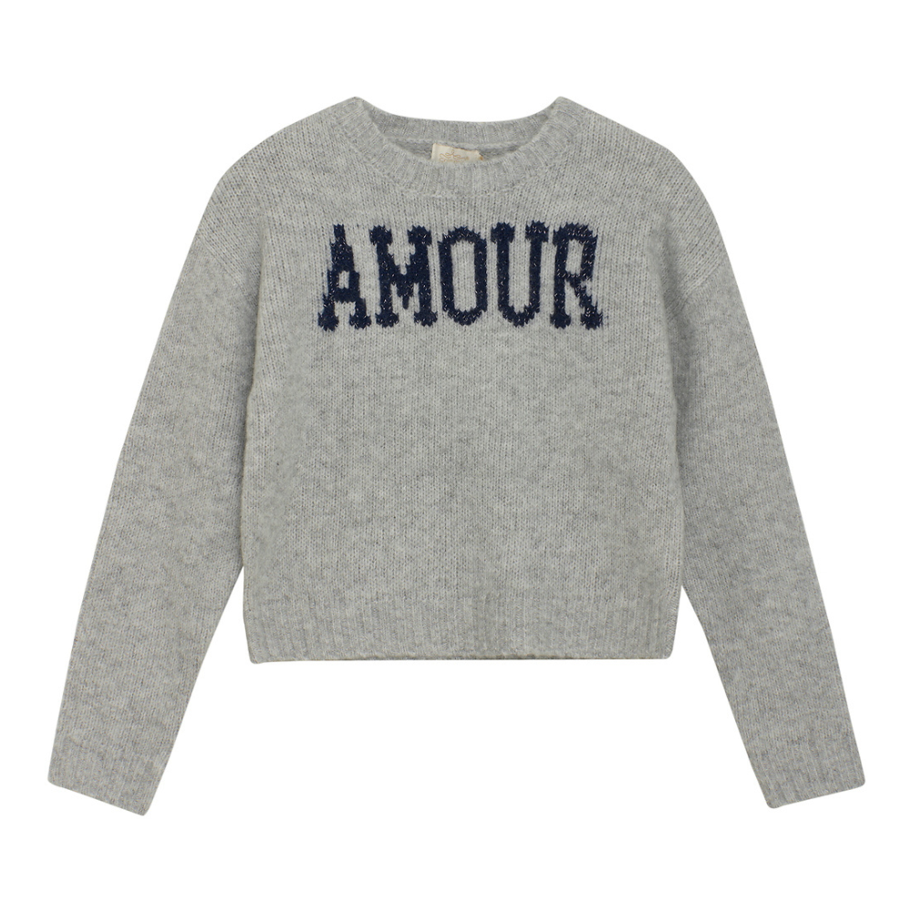 Falleg, grá prjónapeysa frá Creamie. 91% polyester, 5% ull, 2% elastane og 2% metallic yarn.