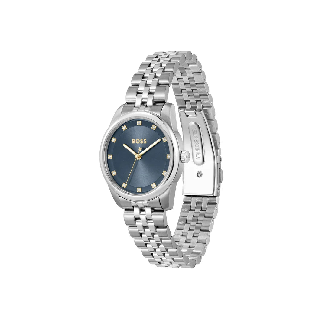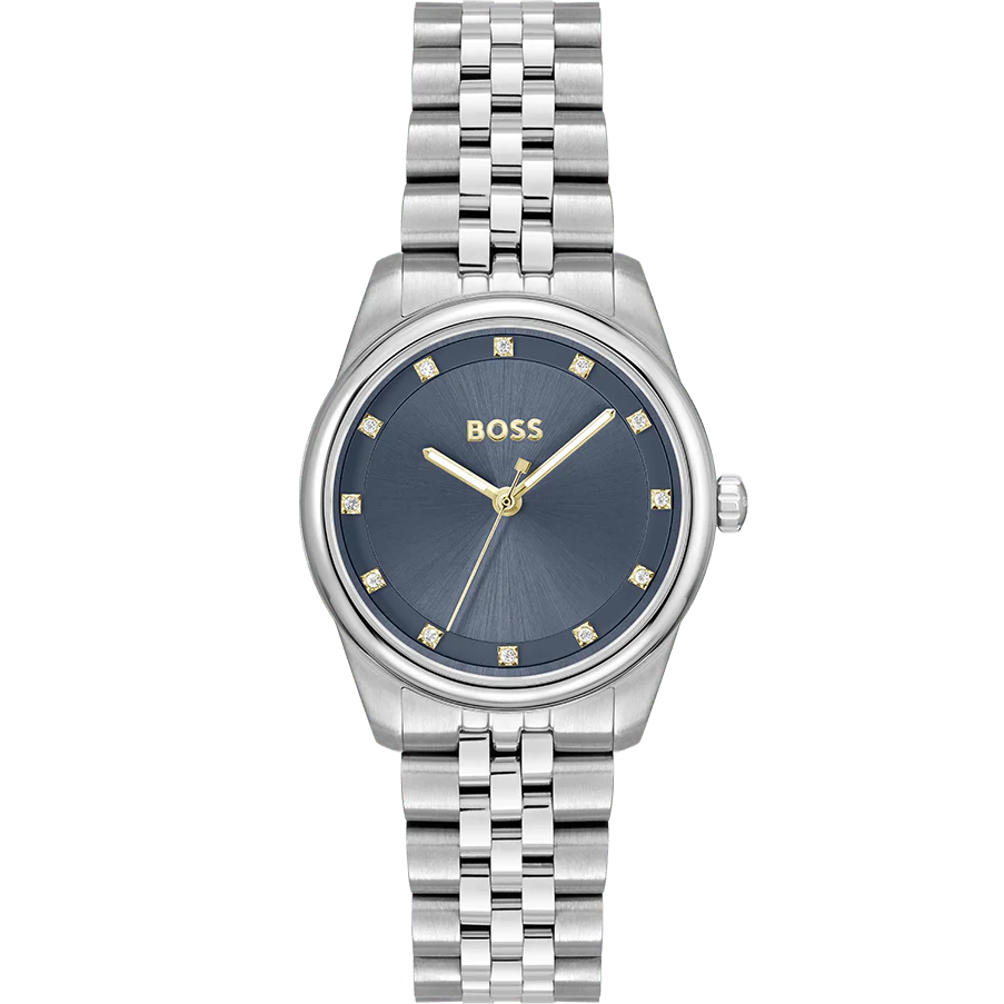 Hugo Boss Graceful Vörunr:1502809 Fallegt dömuúr frá Hugo Boss. Gangverk:Rafhlaða/Quartz Stærð:32mm Úrkassi:Stál  Keðja/ól:Stál Skífa:Blá Gler:Hert gler Vatnsvörn:30m Dagatal:Nei   ... Sjá nánar