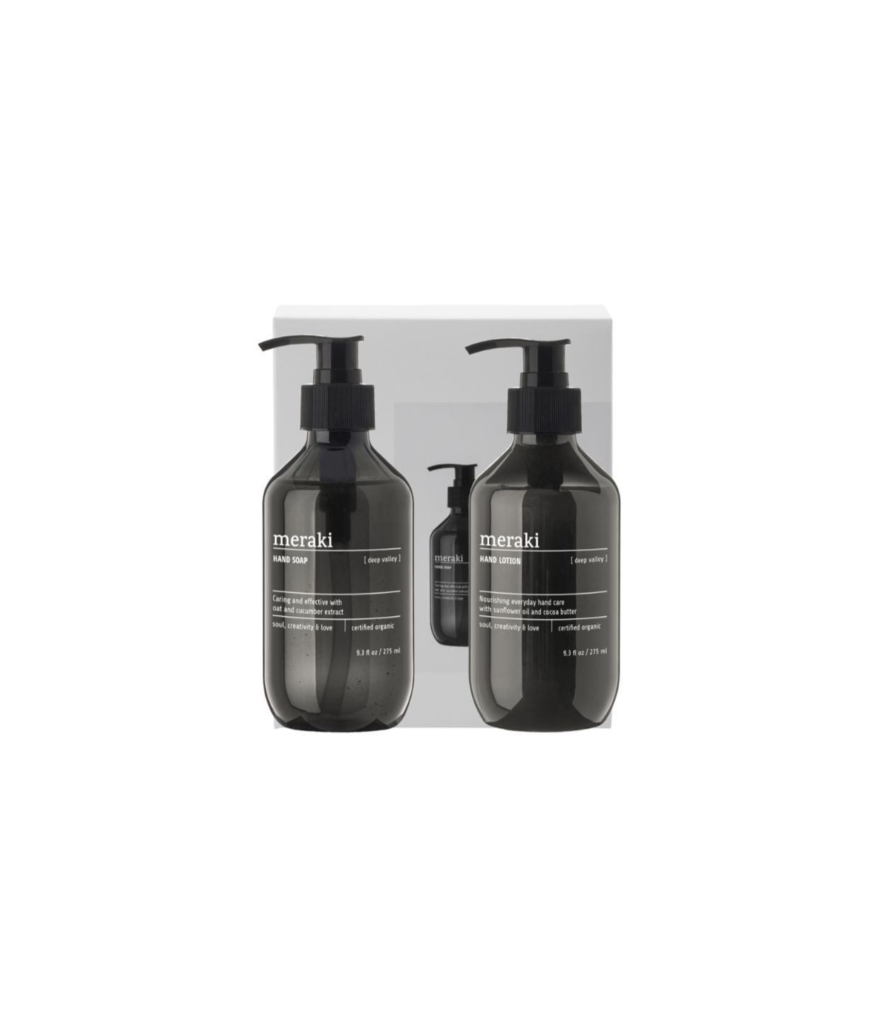 Gjafasettið inniheldur handsápu og handáburð, bæði 275ml. Cosmos vottað.
