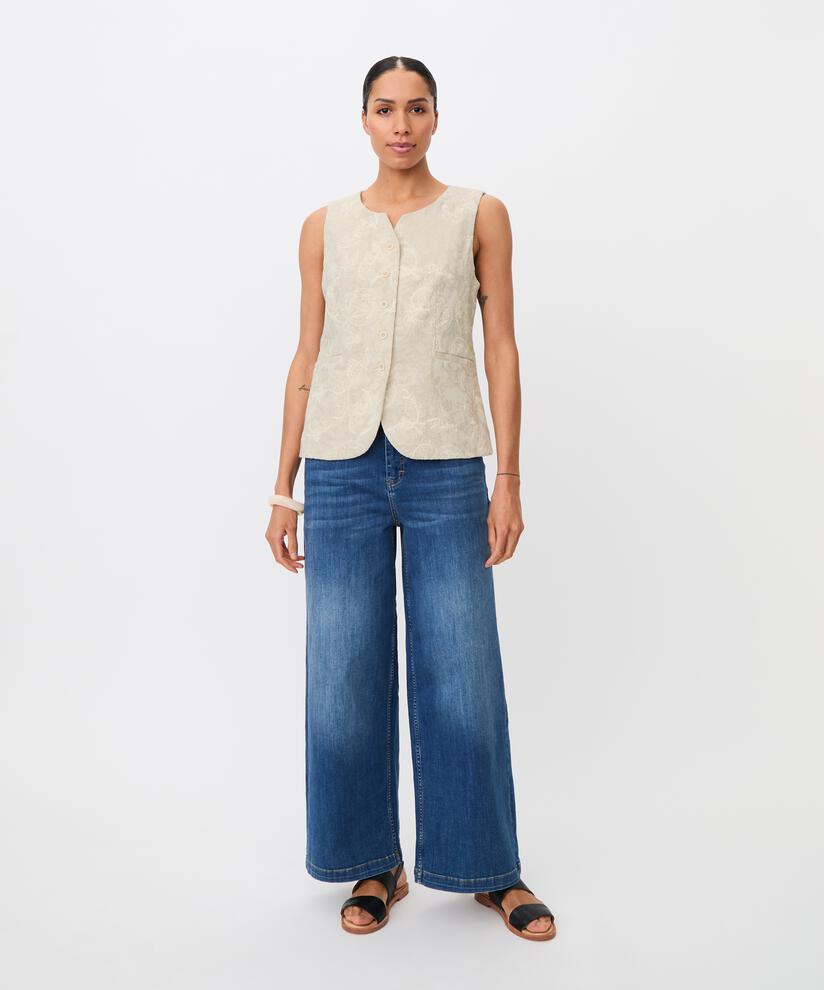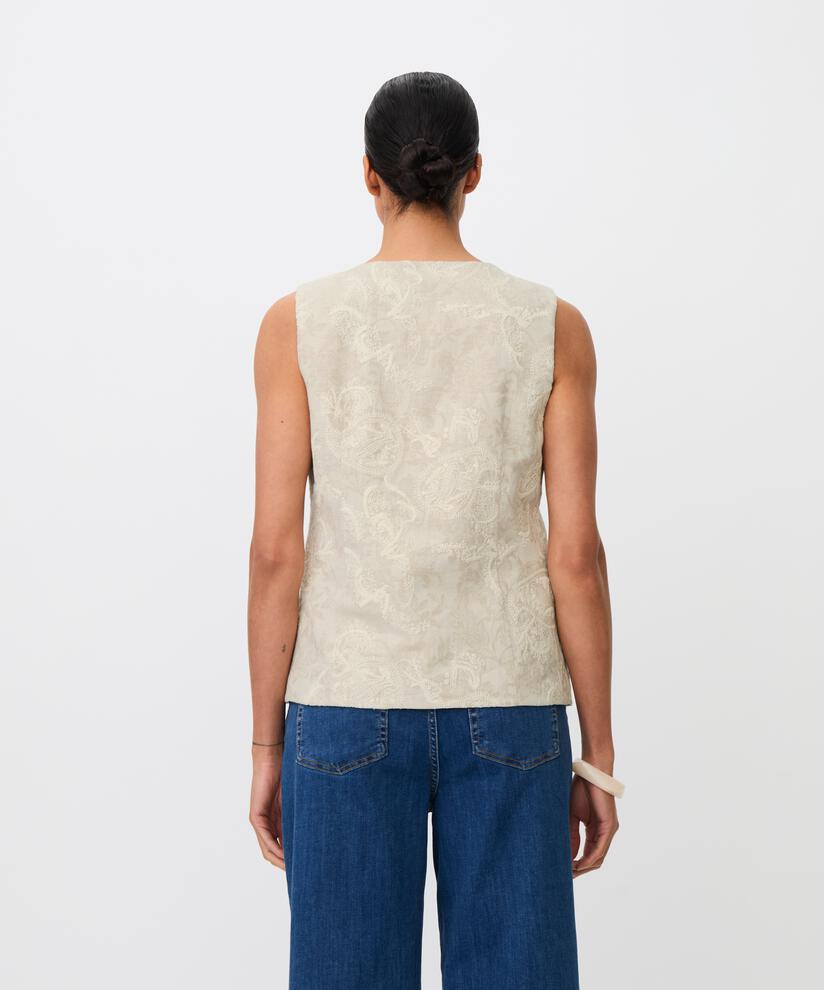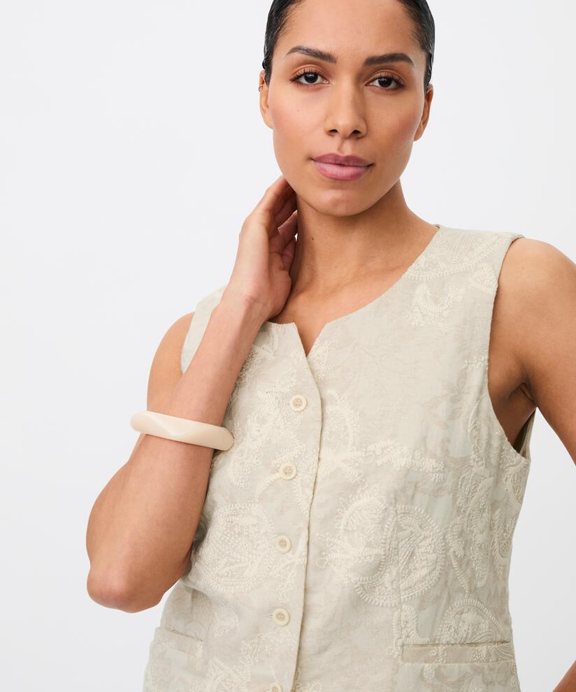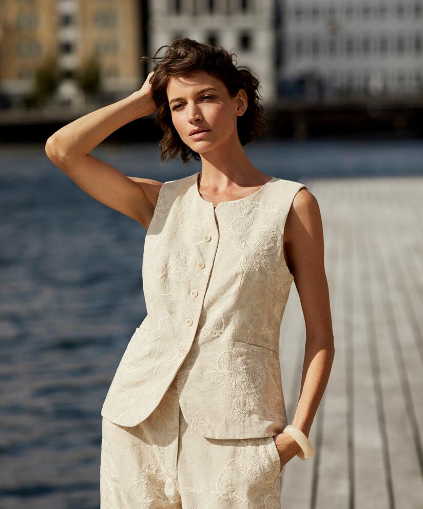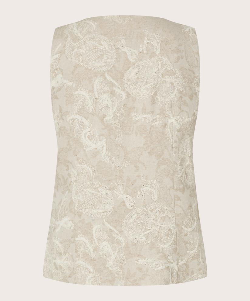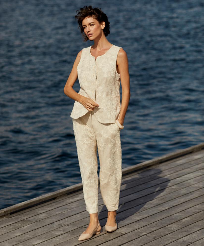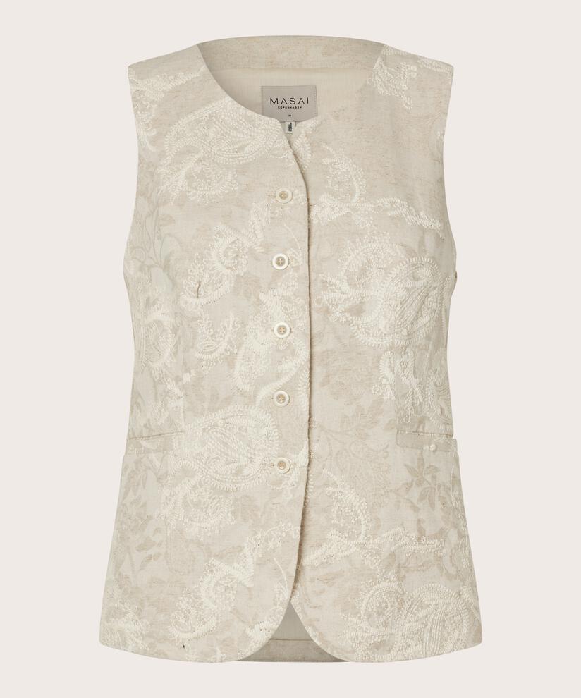 Einstaklega fallegt vesti frá MASAI með fallegu saumuðu mynstri í. Einnig koma buxur við. 40% bómull 38% polyester 12% viscose 10% hör