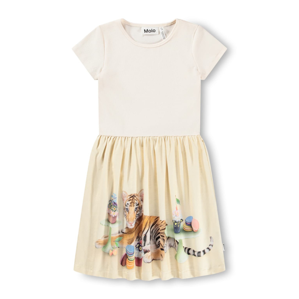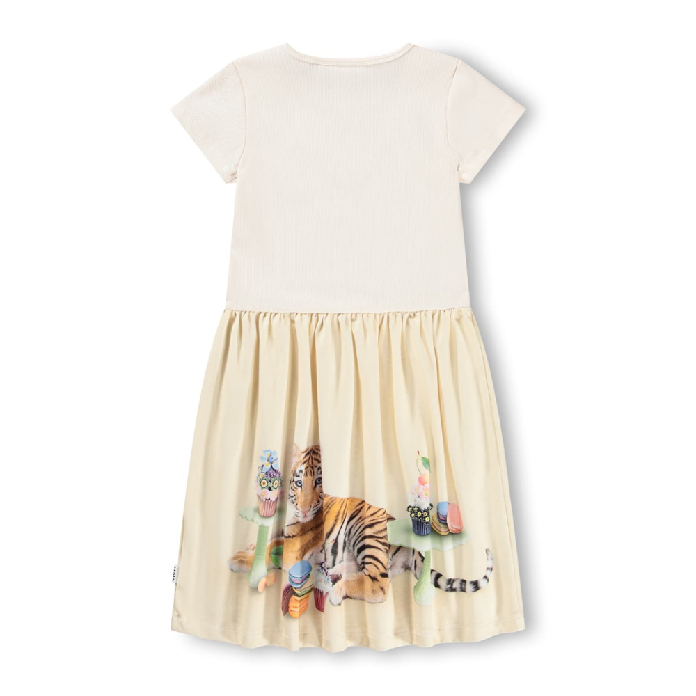 Ljós Molo kjóll með stuttum ermum, einlitum efri part og mynstruðu pilsi. 100% bómull.