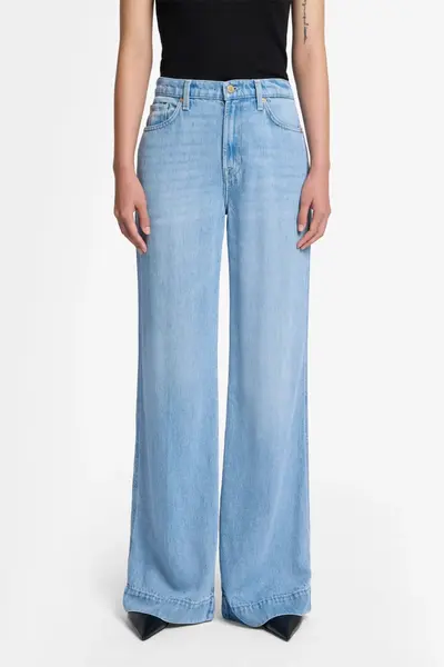 Fallegar útvíðar gallabuxur frá 7 For All Mankind sem eru háar í mittið. Módelið er 170cm á hæð og er í stærð 27.