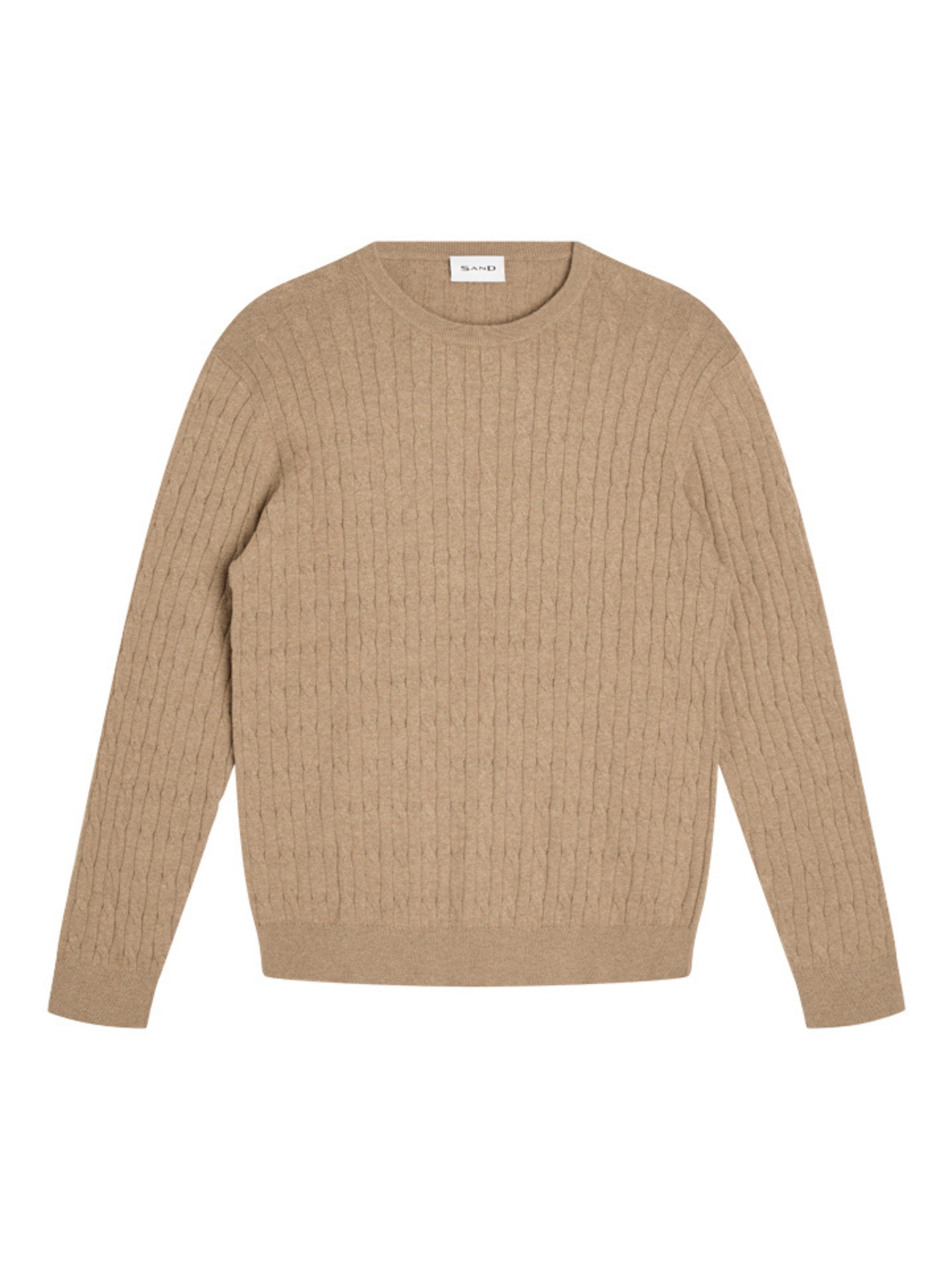 Round neck Rib at neck, hem and cuffs Regular fit Gauge 14 Cable knit Luxury cashmere blend