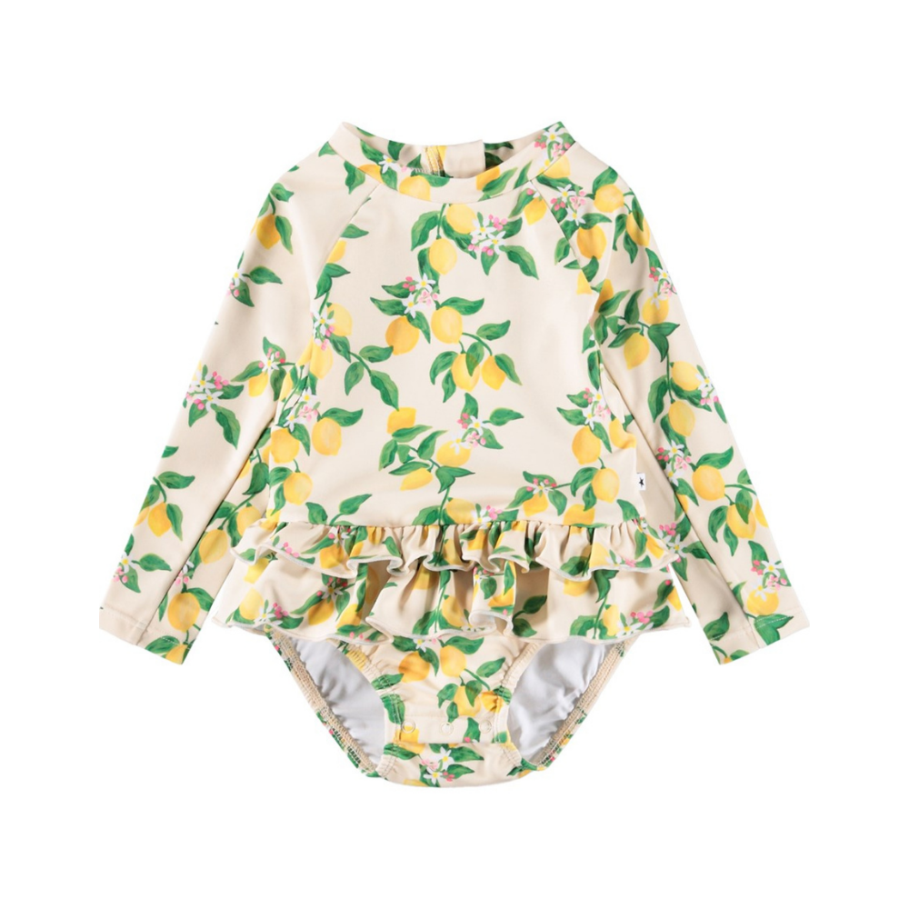Mynstraður sundbolur frá Molo með löngum ermum og pífu yfir mittið. Gott pláss fyrir sundbleiu. UV50+ sólarvörn gegn geilsum sólarinnar. 80% polyester og 20% elastane.