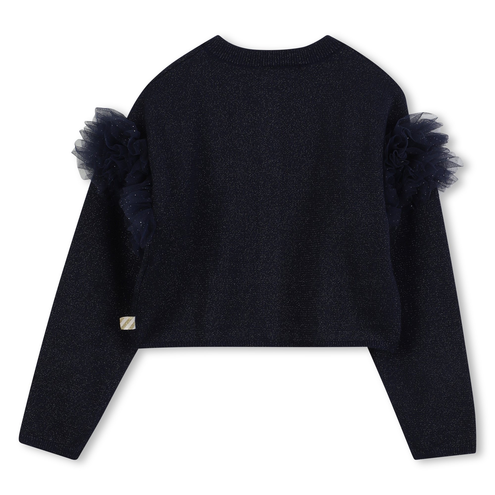 Dökk blá, hneppt peysa með glimmerþráðum. 40% polyamide, 30% acryl, 24% polyester og 6% laine.
