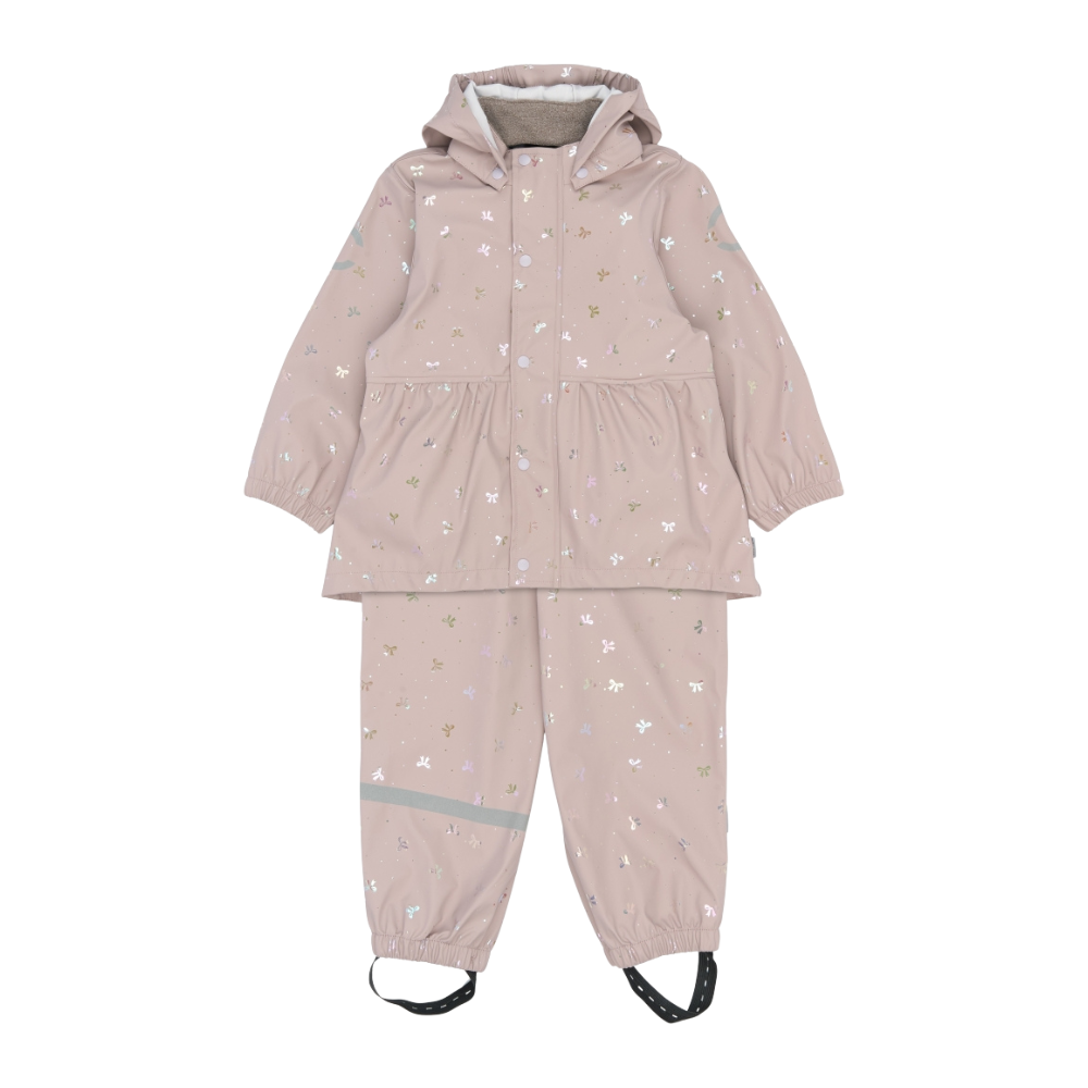 Ljósbleikur regngalli frá Mikk-Line með glitrandi mynstri. Stillanleg fótabönd sem fara undir stígvélin koma í veg fyrir að buxurnar renni upp og fæturnir blotni. 8.000mm vatnsheldni. Stærðir ... Sjá nánar